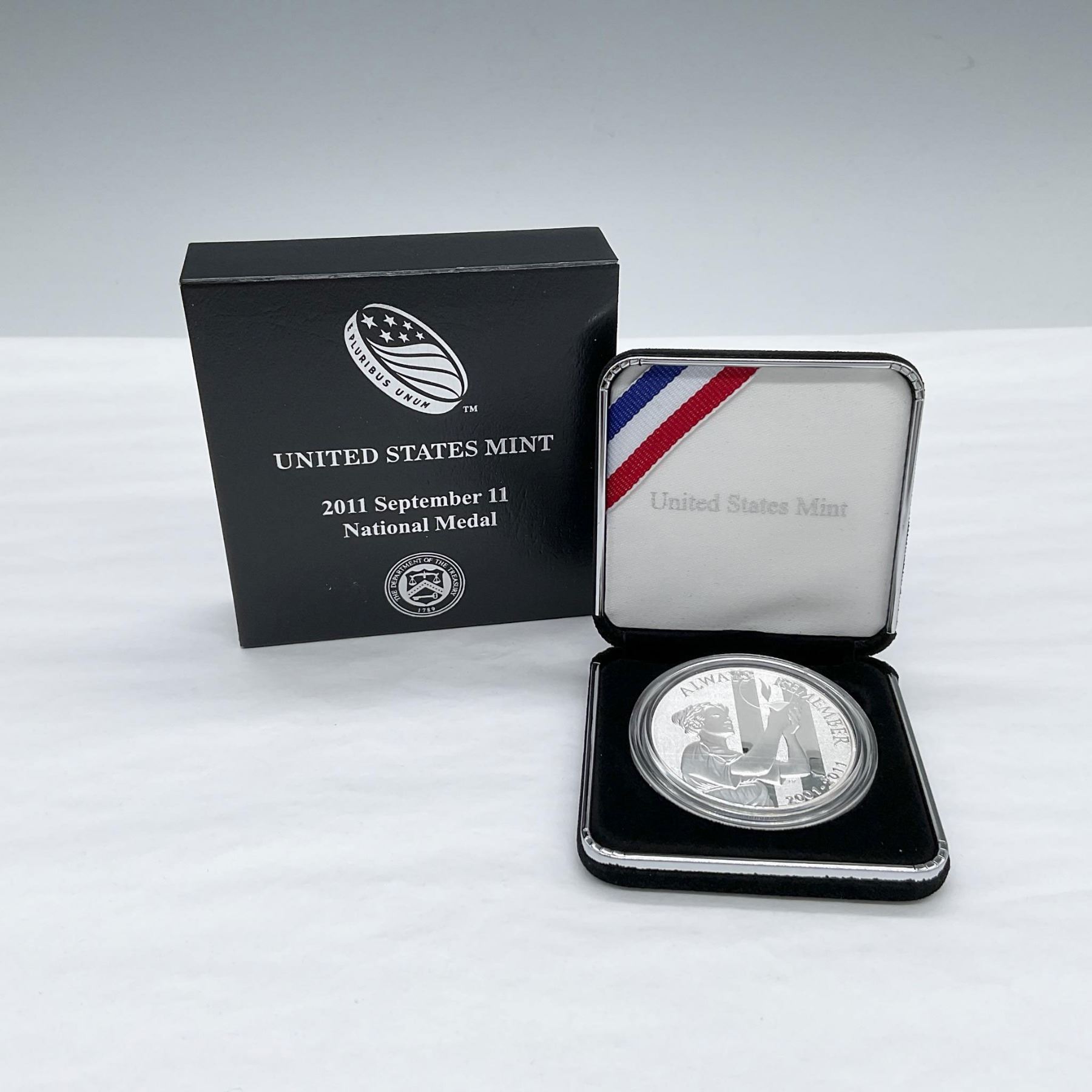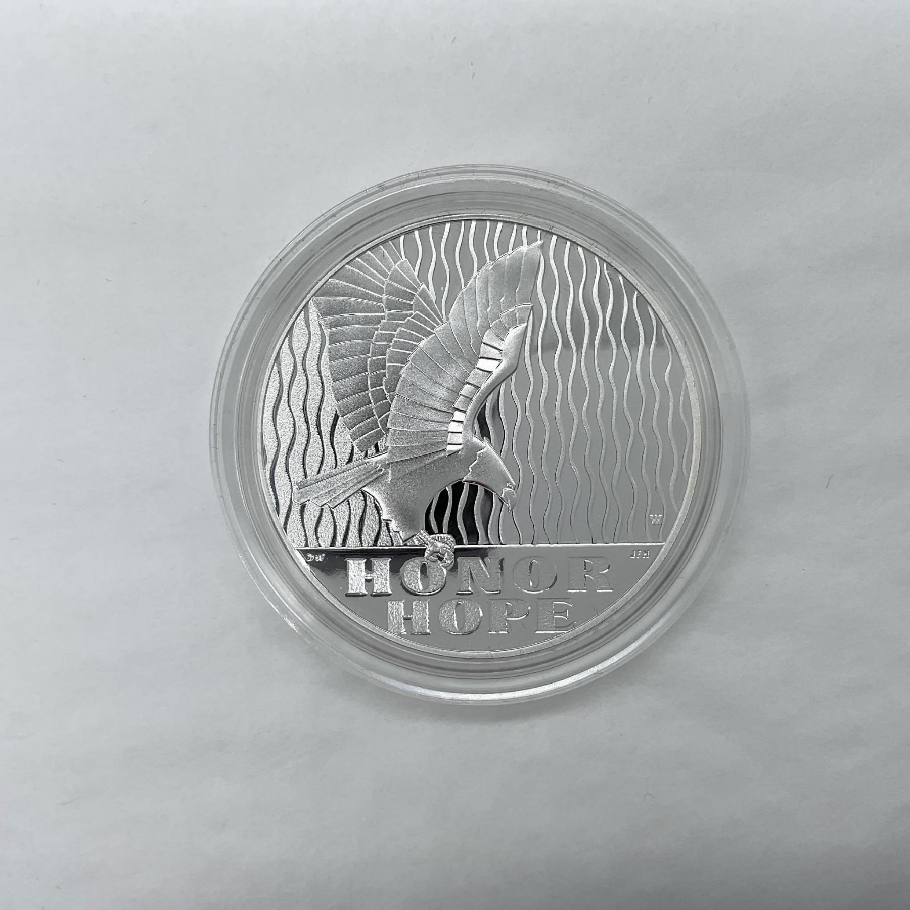 West Point Mint. The obverse side depicts Lady Liberty holding the Lamp of Remembrance, behind her are the beacons of lights. The reverse side features an eagle against a background of cascading water. The coin is in a protective case. The case is approximately: 0.25"D x 2" dia. This item has its original box: 3.5"L x 3.5"W x 1"H.
