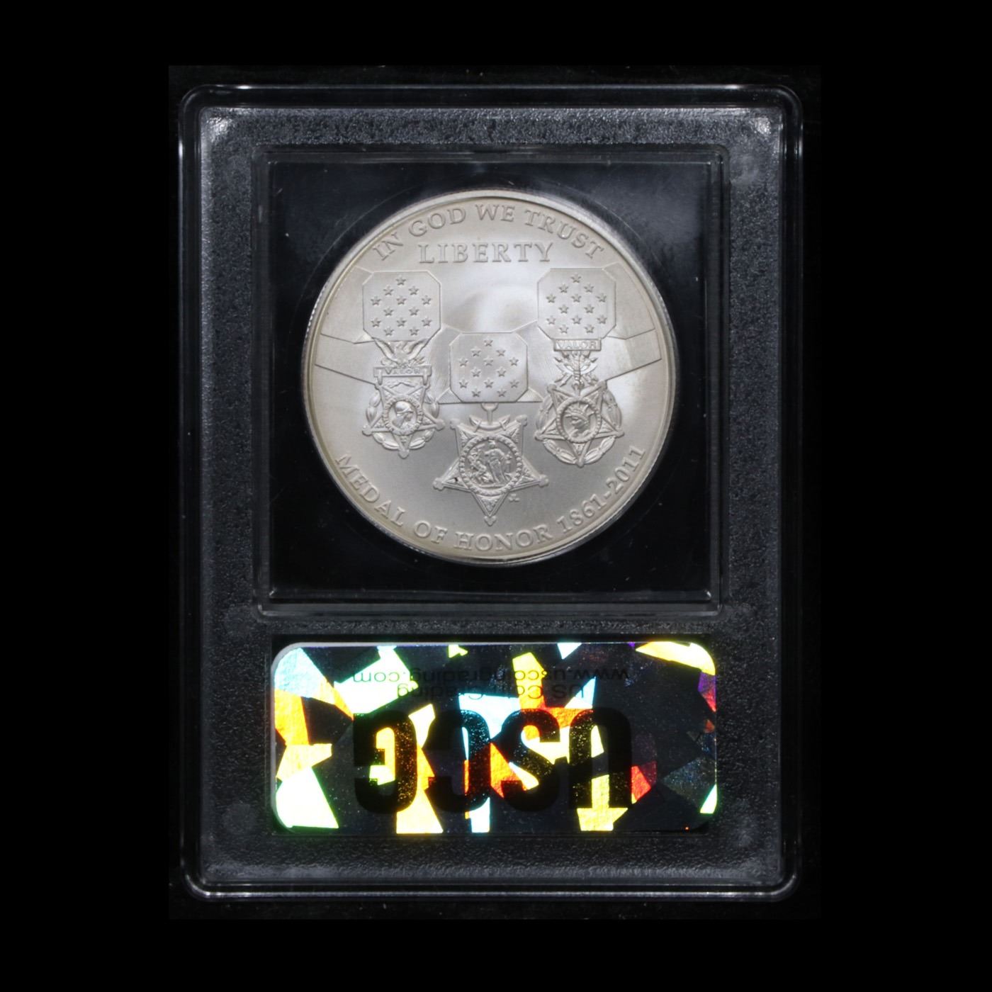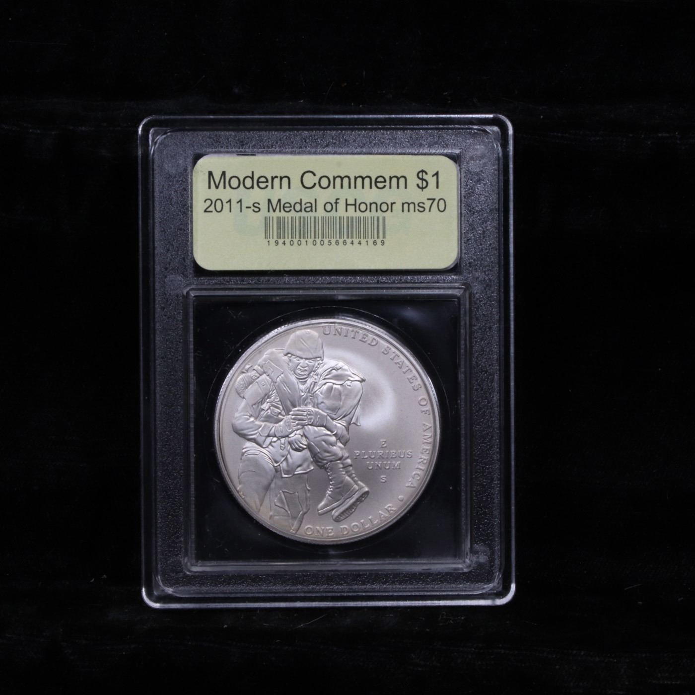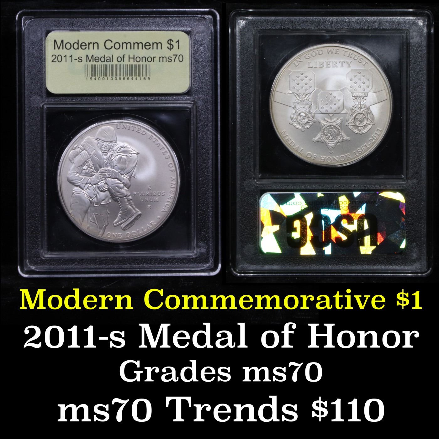 2011-s Medal of Honor Modern Commem Dollar $1 Graded ms70, Perfection By USCG. The 2011 Medal of Honor was issued in 2 designs as a Silver Dollar and $5 Gold. The obverse of the Medal of Honor Silver Dollar coin depicts three current Army, Navy and Air Force Medals of Honor, left to right. The ribbon with field of stars in the center is the common feature of all three medals, reflecting the joint nature of modern era warfare and the fact that the Medal of Honor is the only U.S. military medal worn around the neck. The reverse features a contemporary Army infantry soldier carrying a wounded soldier to safety under enemy fire, reflecting the courage and self-sacrifice of all Medal of Honor recipients. This image conveys the courage, selfless sacrifice and patriotism of Medal of Honor recipients, as well as the criteria established by Congress in 1963 requiring that all Medals of Honor be awarded. This Perfect coin is graded MS70 by USCG.