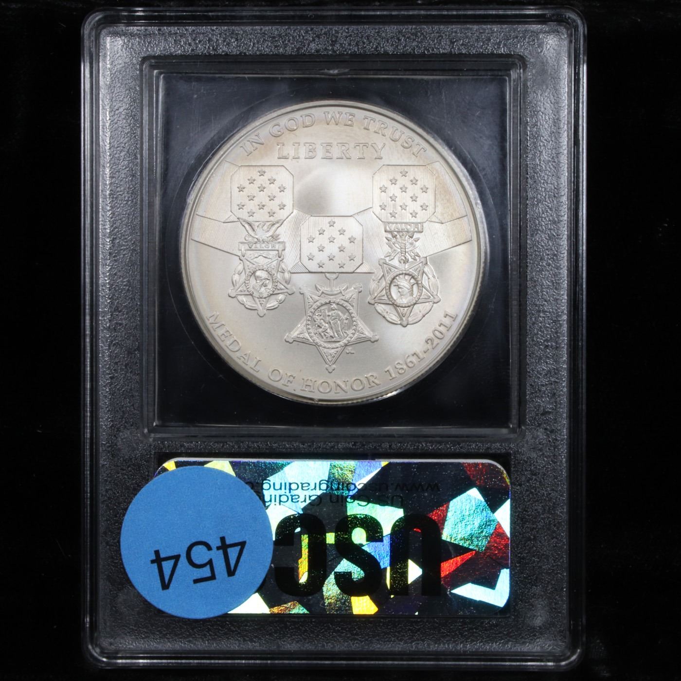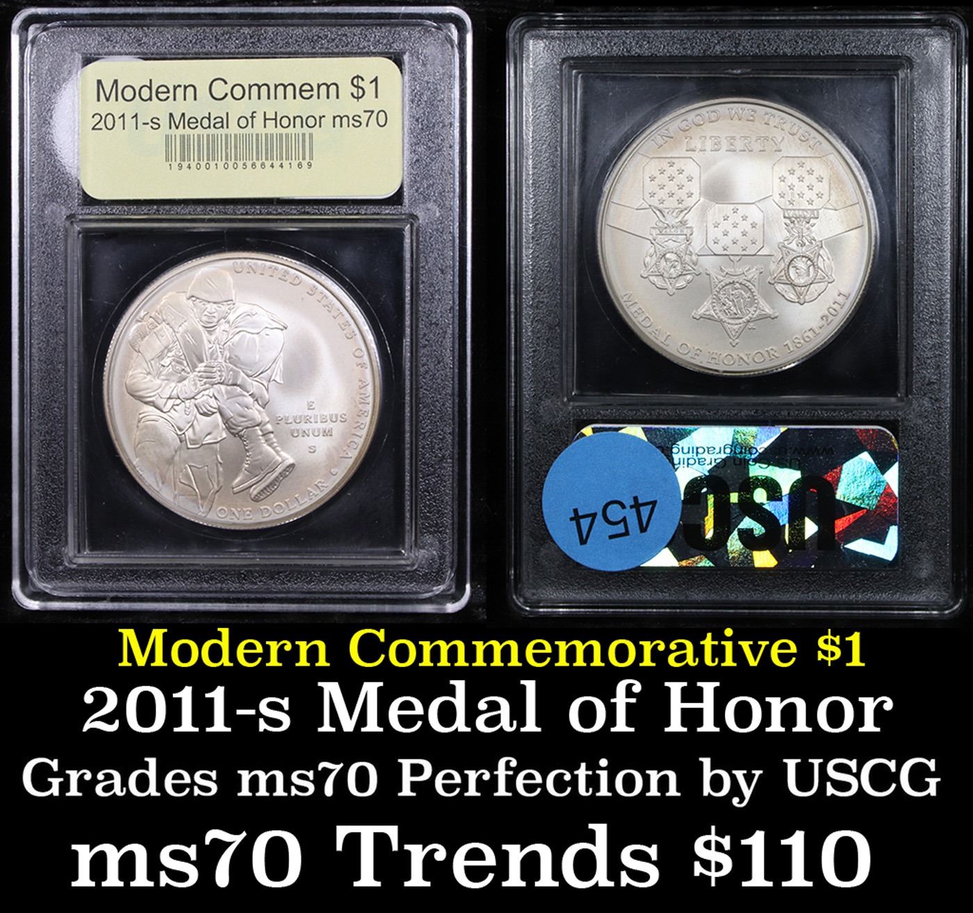 2011-s Medal of Honor Modern Commem Dollar $1 Graded ms70, Perfection By USCG. The 2011 Medal of Honor was issued in 2 designs as a Silver Dollar and $5 Gold. The obverse of the Medal of Honor Silver Dollar coin depicts three current Army, Navy and Air Force Medals of Honor, left to right. The ribbon with field of stars in the center is the common feature of all three medals, reflecting the joint nature of modern era warfare and the fact that the Medal of Honor is the only U.S. military medal worn around the neck. The reverse features a contemporary Army infantry soldier carrying a wounded soldier to safety under enemy fire, reflecting the courage and self-sacrifice of all Medal of Honor recipients. This image conveys the courage, selfless sacrifice and patriotism of Medal of Honor recipients, as well as the criteria established by Congress in 1963 requiring that all Medals of Honor be awarded. This Perfect coin is graded MS70 by USCG.