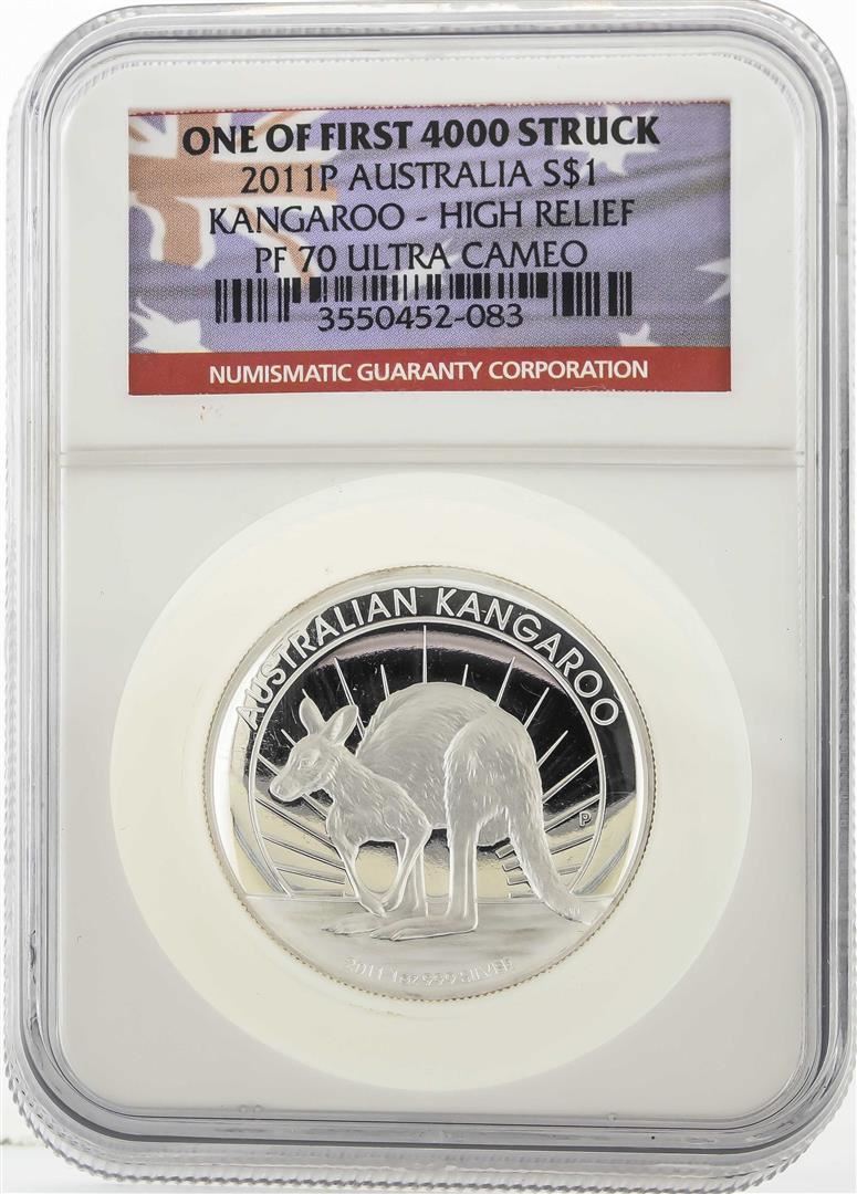 One 2011P $1 Australia Kangaroo High Relief Silver Coin NGC PF70 Ultra Cameo. NGC Certified.
