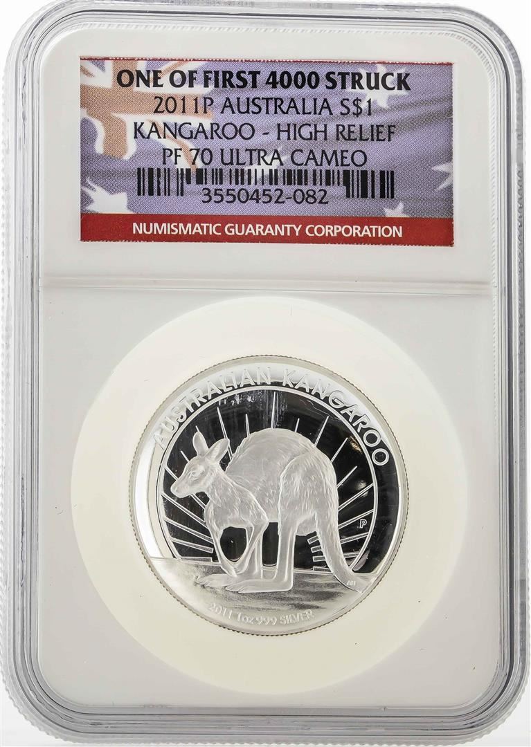 One 2011P $1 Australia Kangaroo High Relief Silver Coin NGC PF70 Ultra Cameo. NGC Certified.