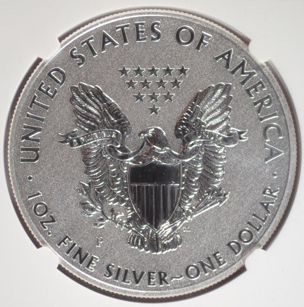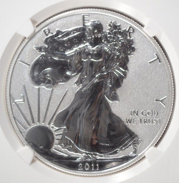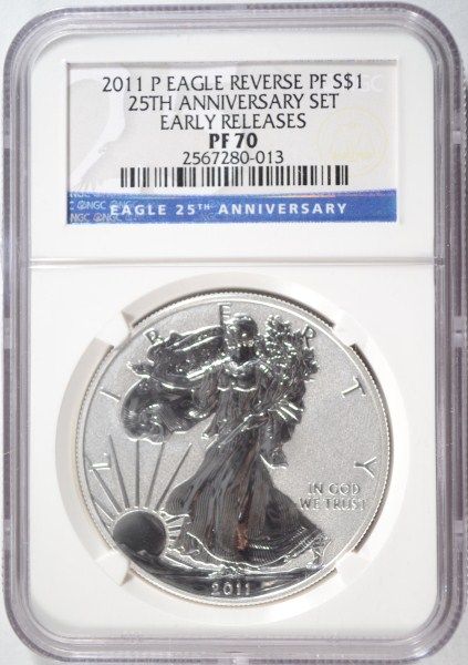 A PERFECT EXAMPLE OF THE 2011 REVERSE PROOF SILVER EAGLE, FOUND ONLY IN THE 25Th ANNIVERSARY SET. EST. $555.00 TO $590.00