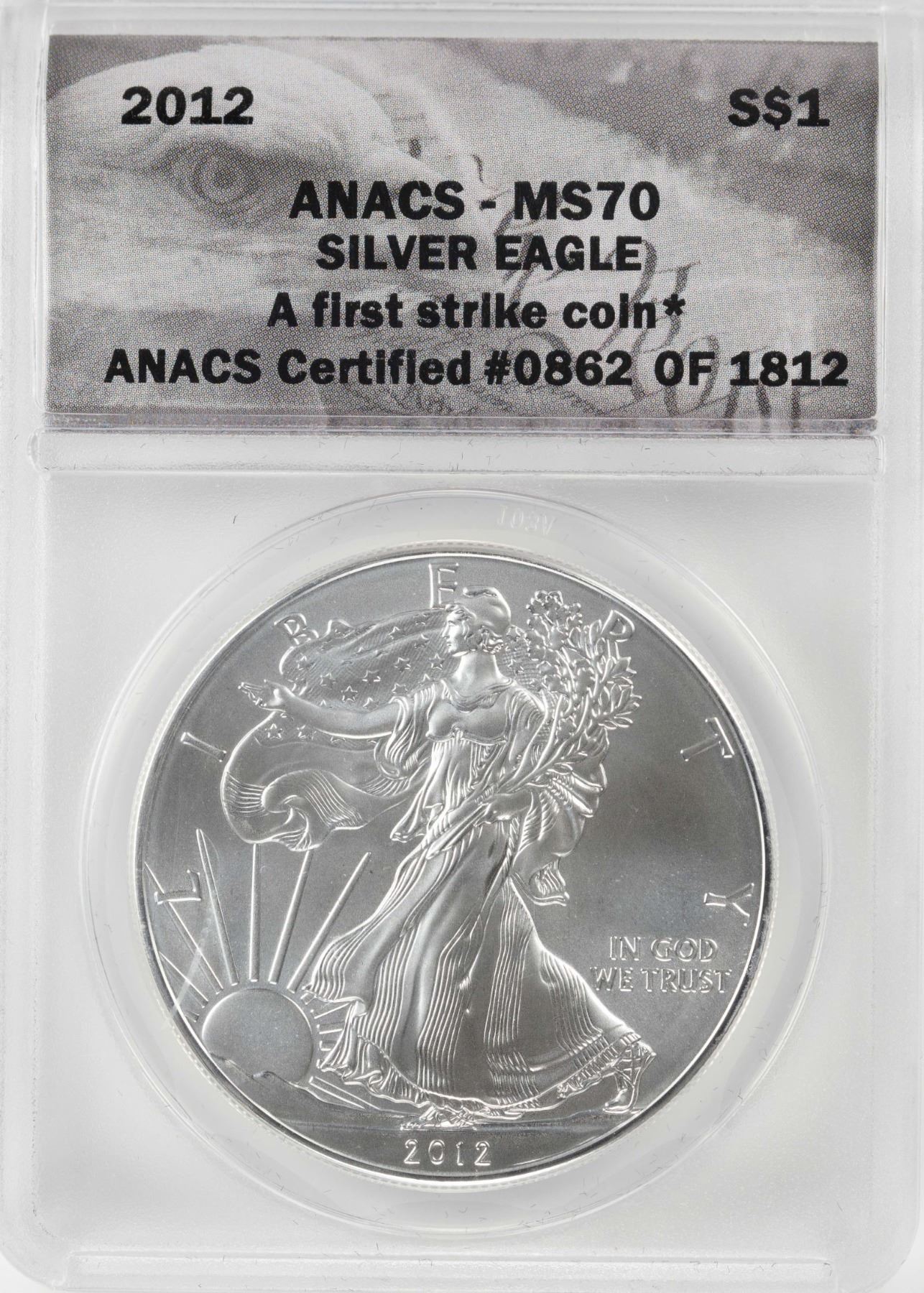 One 2012 $1 American Silver Eagle Coin ANACS MS70 First Strike.