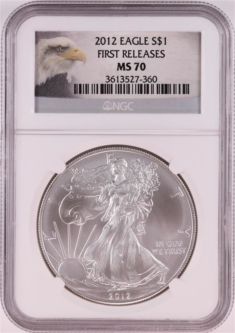 One 2012 $1 American Silver Eagle Coin NGC MS70 First Releases. NGC Certified.