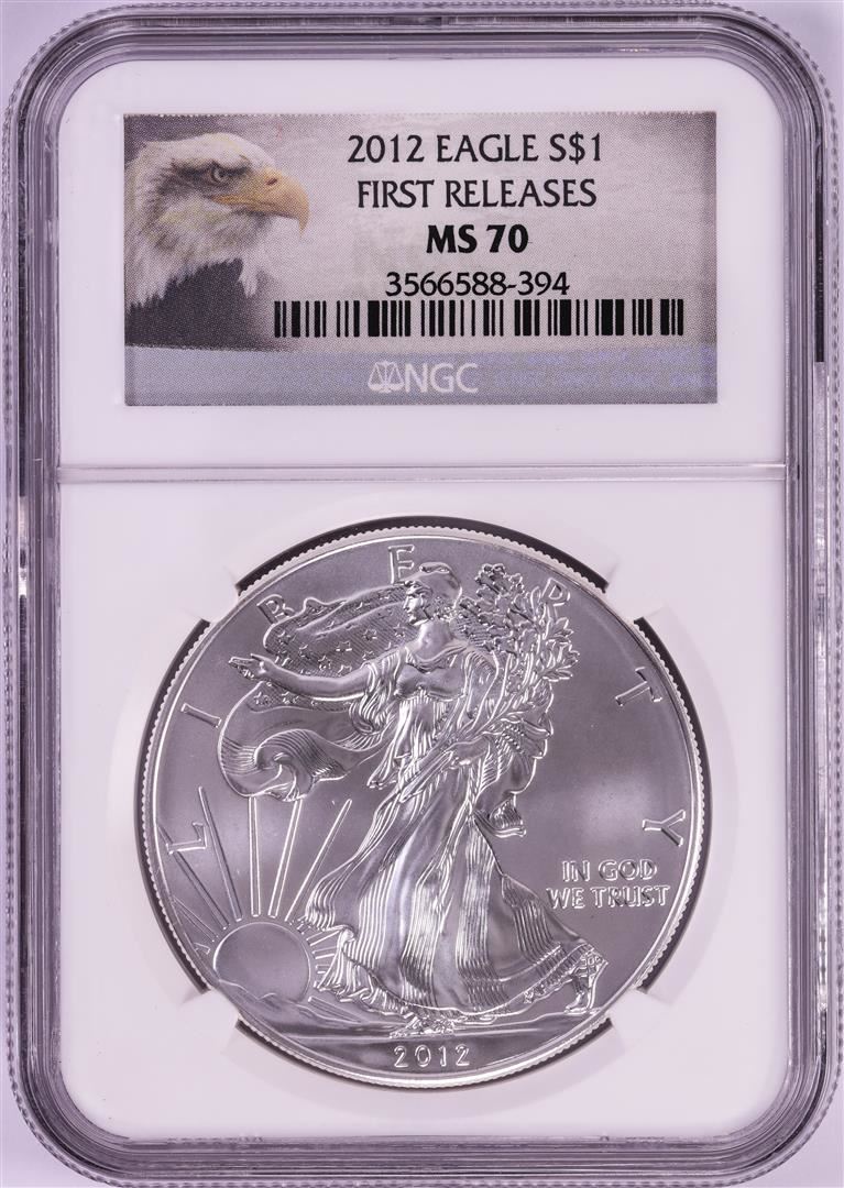 One 2012 $1 American Silver Eagle Coin NGC MS70 First Releases. NGC Certified.