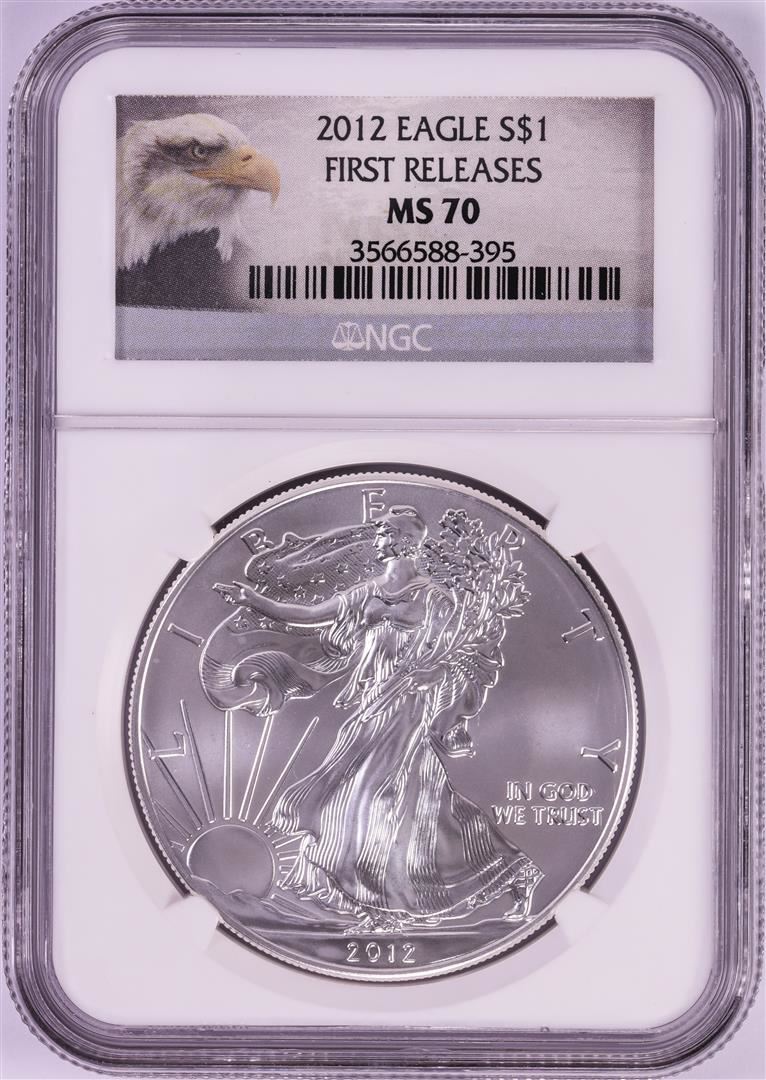 One 2012 $1 American Silver Eagle Coin NGC MS70 First Releases. NGC Certified.