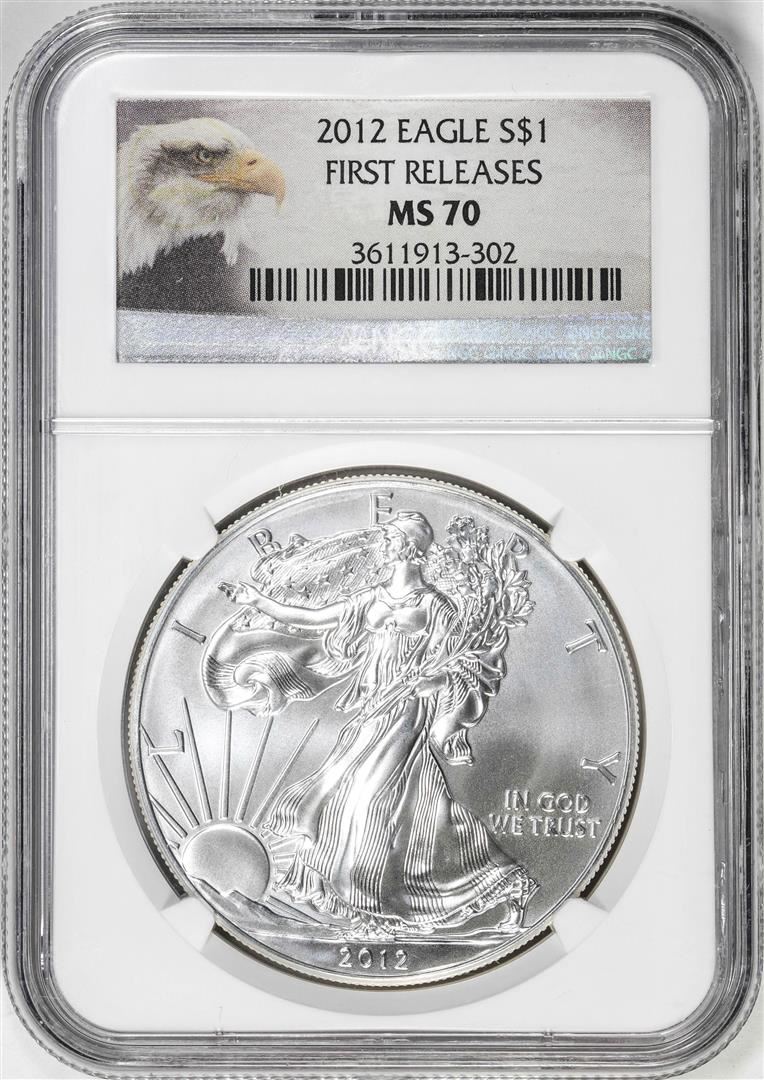 One 2012 $1 American Silver Eagle Coin NGC MS70 First Releases. NGC Certified.