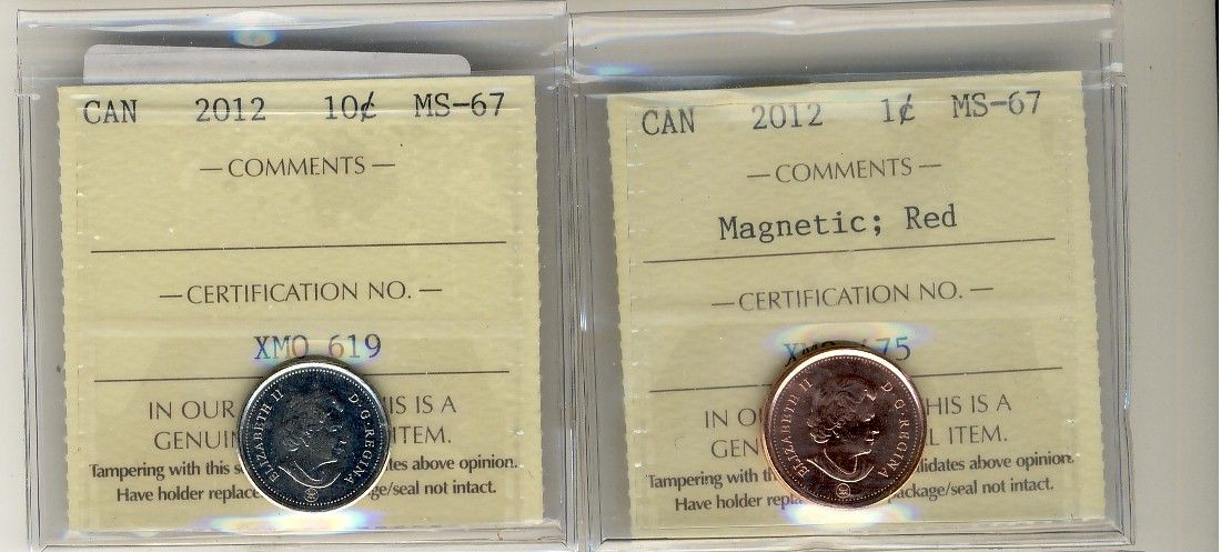 2012 1¢ Magnetic & 10¢ ICCS MS67. Lot of 2 coins.