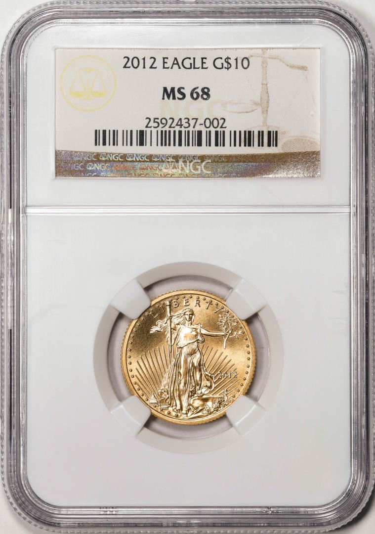 One 2012 $10 American Gold Eagle Coin NGC MS68. NGC Certified.