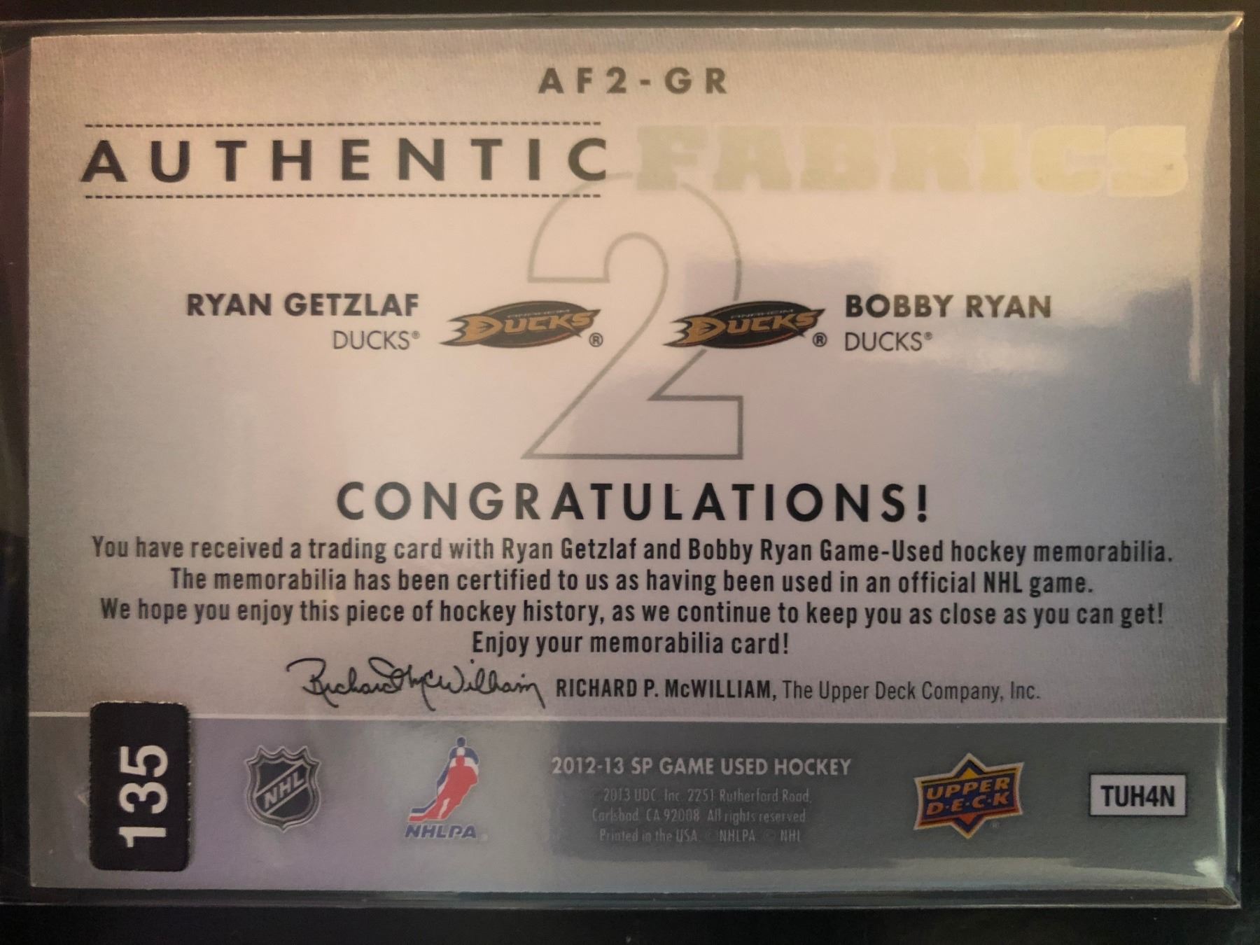 Bobby Ryan Dual Jersey Card #AF2-GR