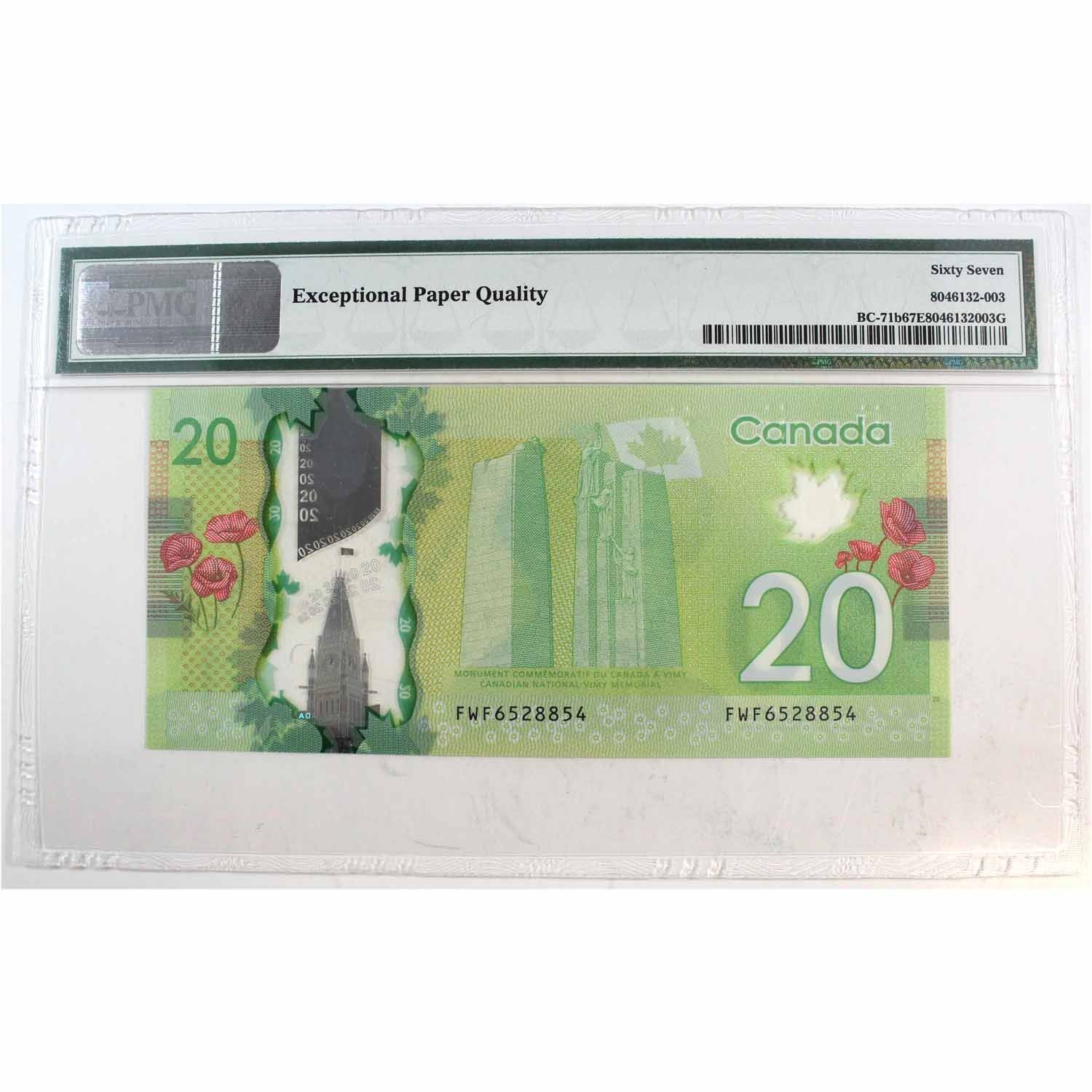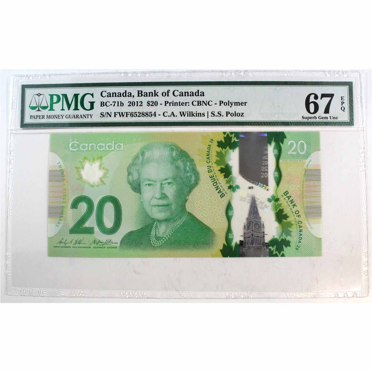 2012 $20 BC-71b, Bank of Canada, Wilkins-Poloz, Printer: CBNC-polymer, FWF Prefix PMG Certified GUNC-67