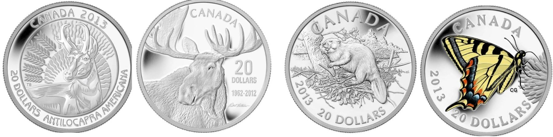 2012 $20 Fine Silver Coin Bull Moose from The Moose Family, 2013 Beaver, 2013 Untamed Canada: Pronghom, and 2013 Butterflies.