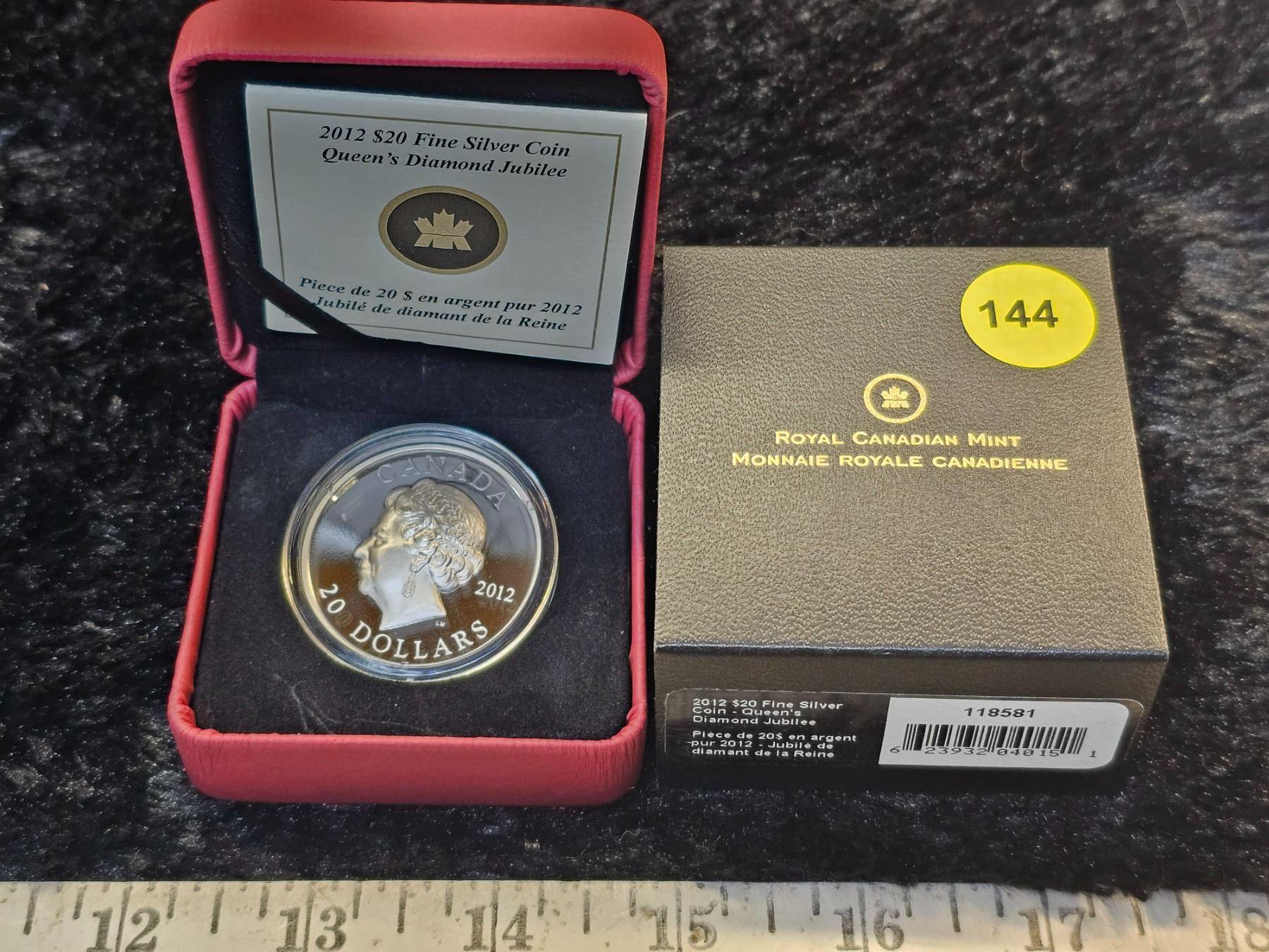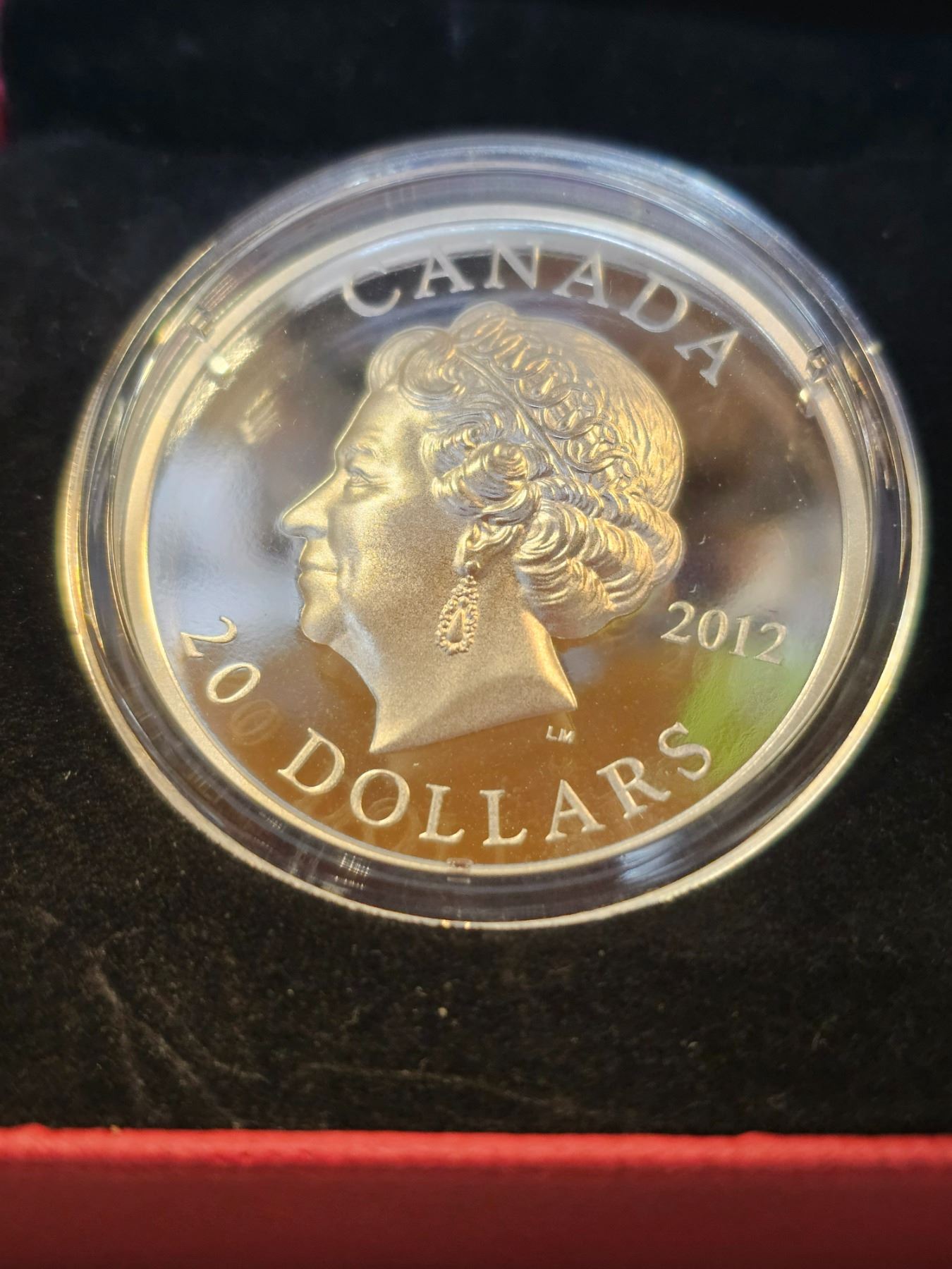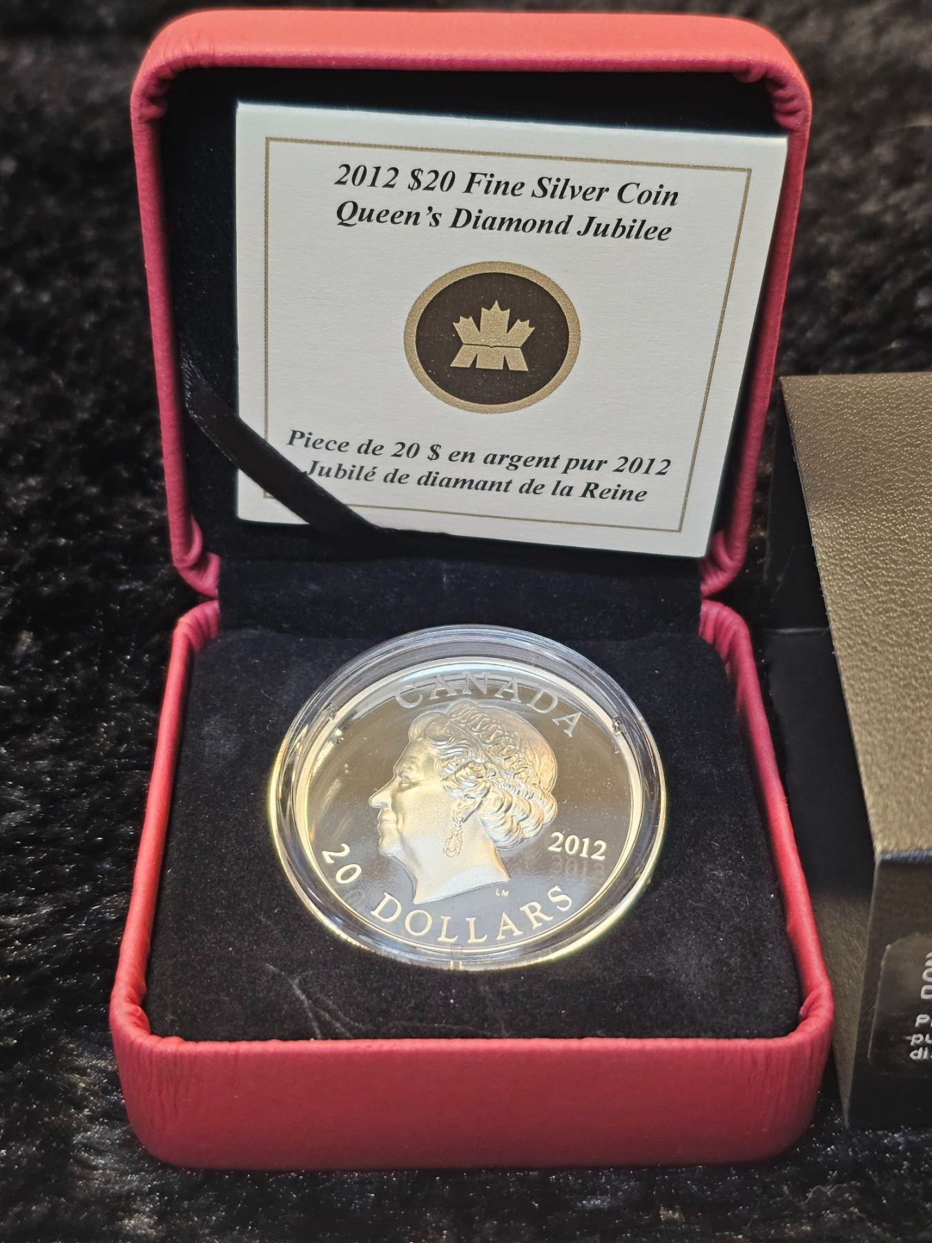 2012 $20 Queen Elizabeth Diamond Jubilee. Ultra High Relief. Proof with Ultra Heavy Cameo. 99.99% pure Silver. Housed in its original Royal Canadian Mint case & box of issue, along with a Certificate of Authenticity.