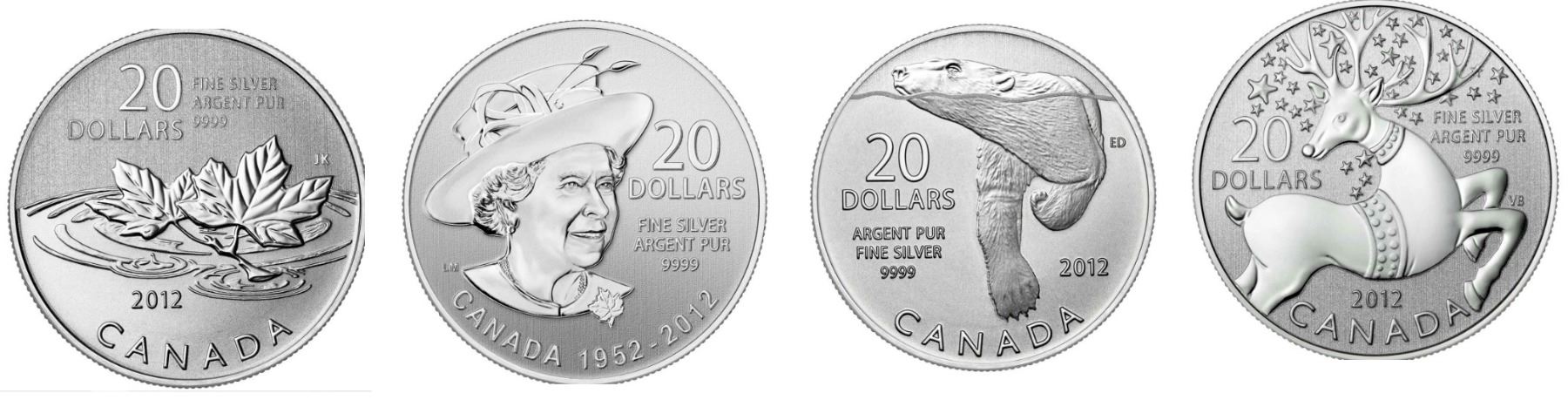 2012 $20 for $20, 4 of each except Maple (5), lot of 17 coins, ture.