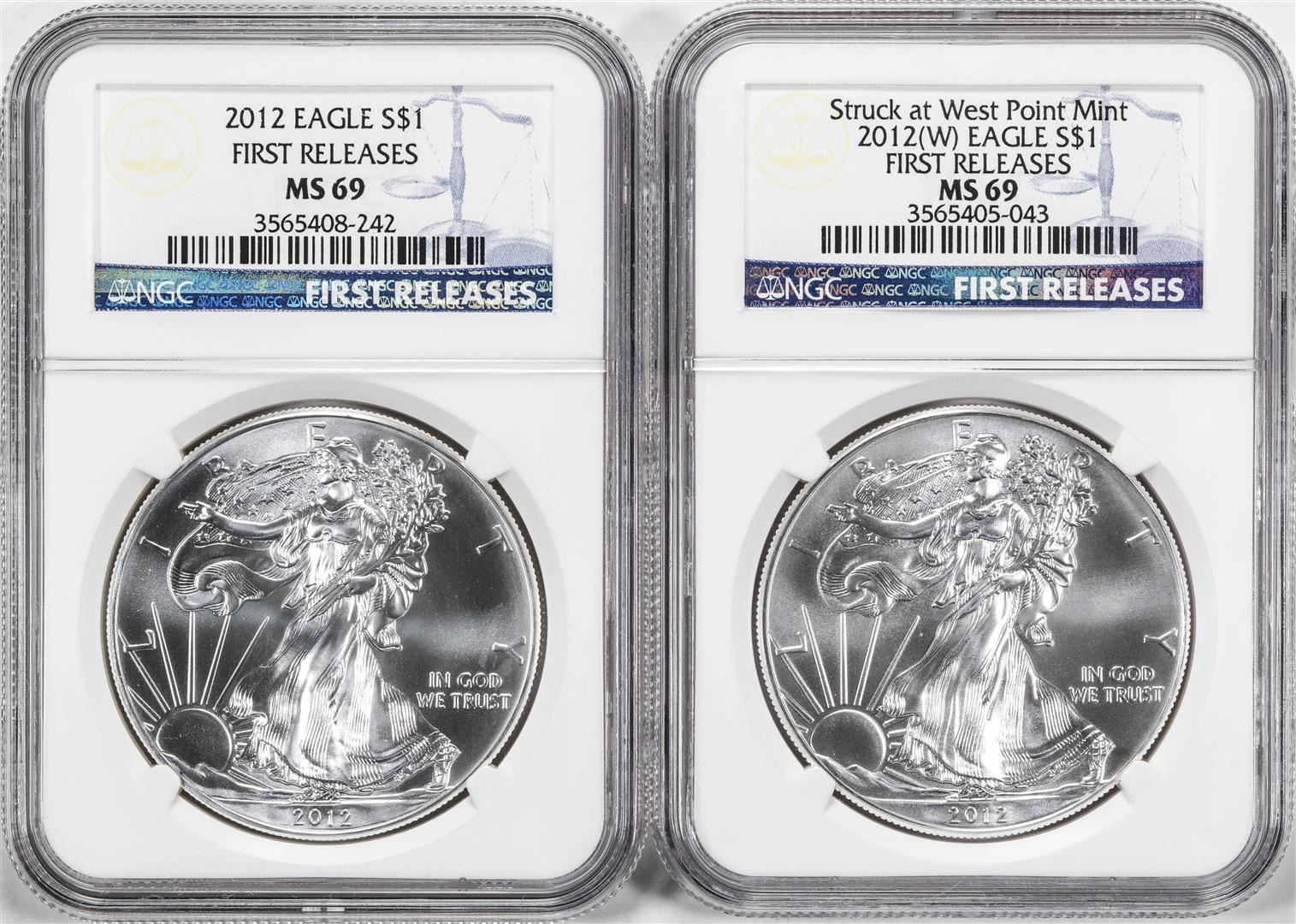 2012 & 2012-(W) $1 American Silver Eagle Coins NGC MS69 First Releases