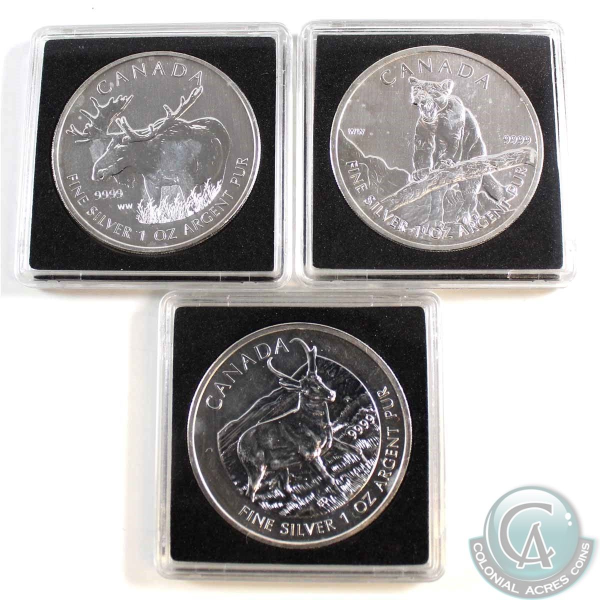2012-2013 Canada $5 Wildlife 1oz Fine Silver Coins (TAX Exempt). You will receive the 2012 Moose, 2012 Cougar, and 2013 Antelope. 3pcs.