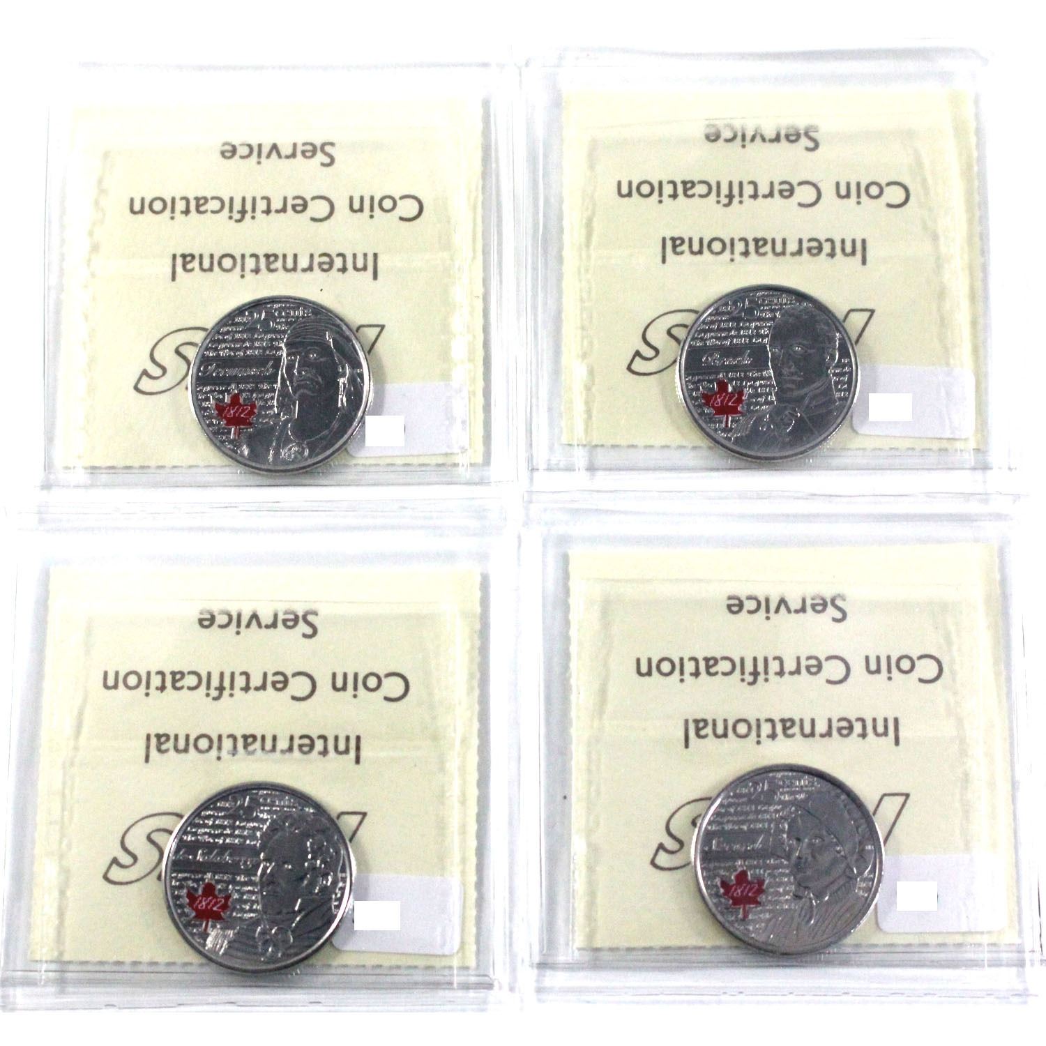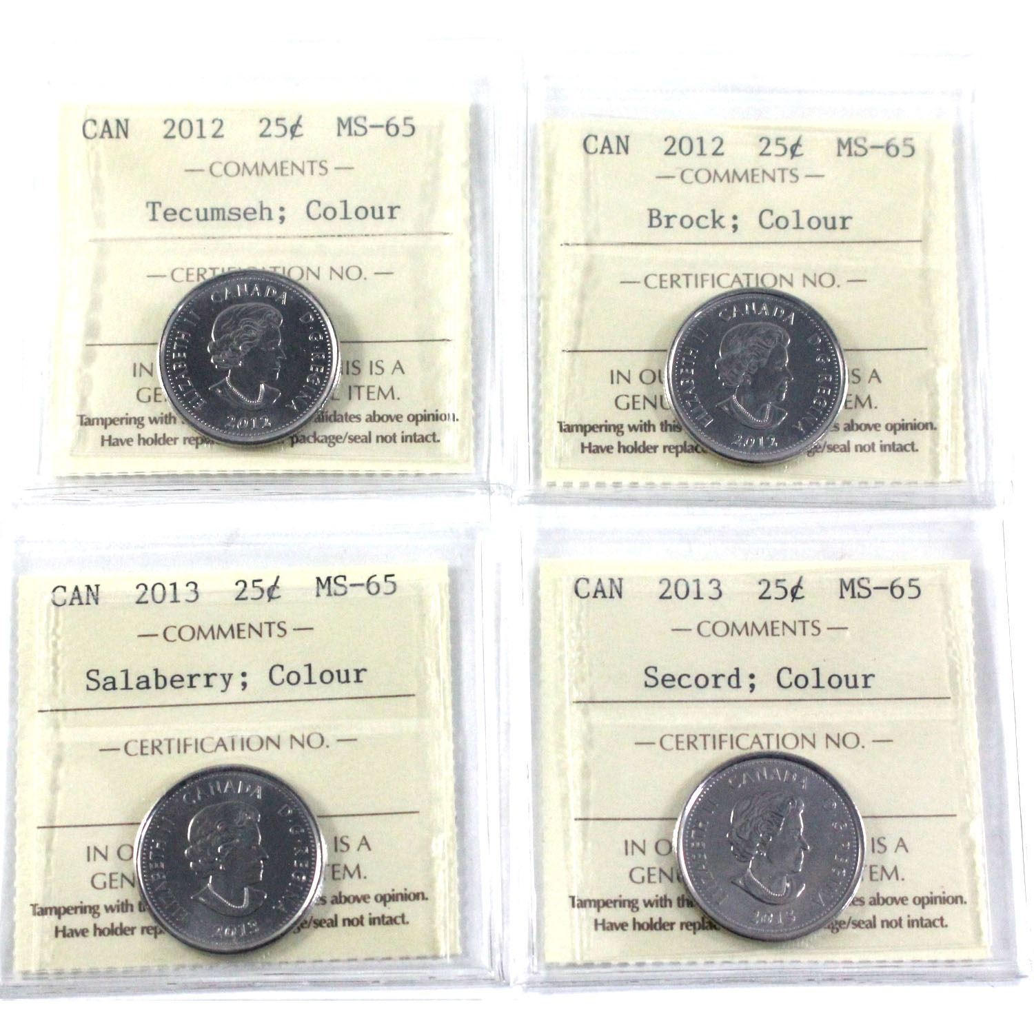 2012-2013 Canada Coloured 25-cent ICCS Certified MS-65 - 2012 Tecumseh, 2012 Brock, 2013 Salaberry & 2013 Secord. 4pcs