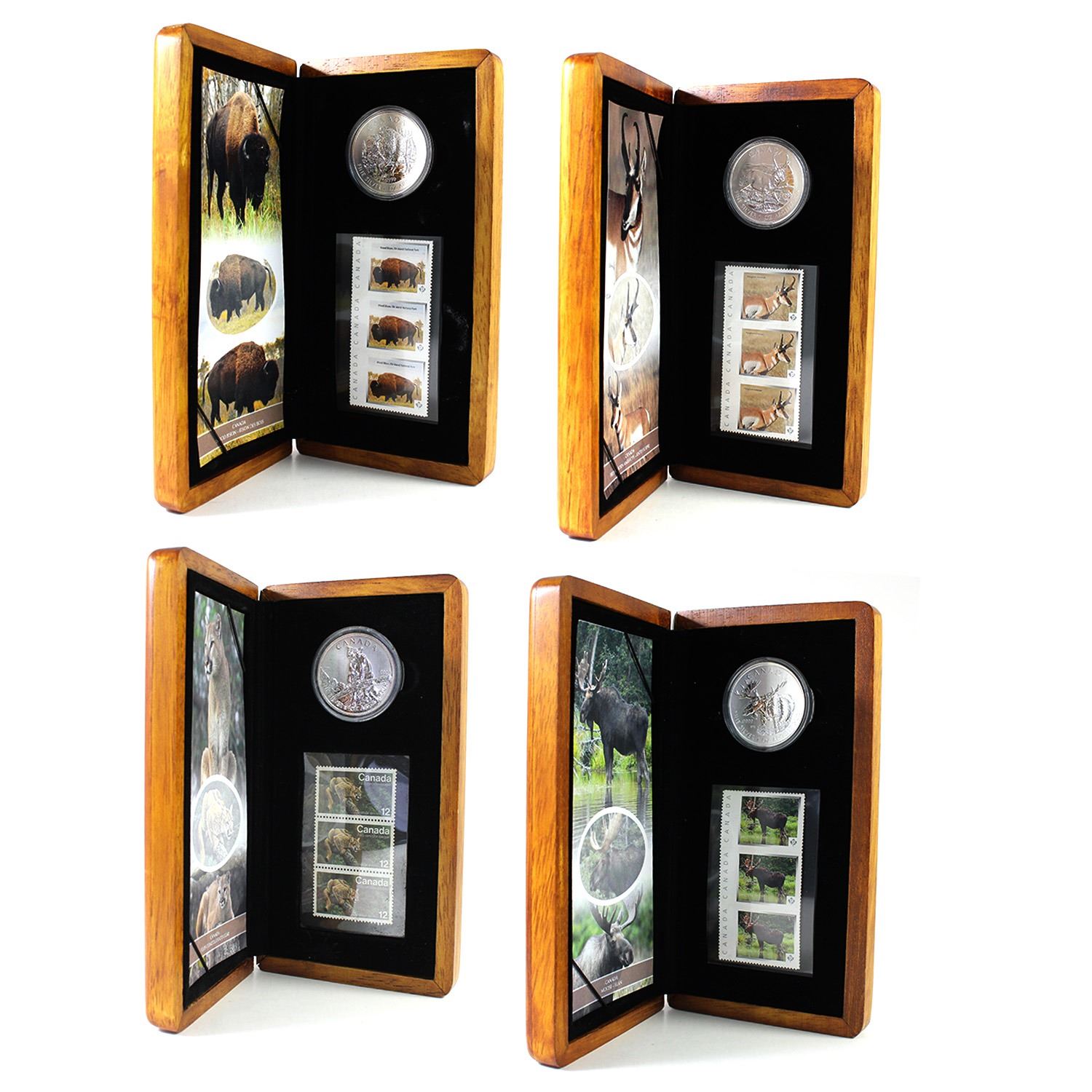 2012-2013 Coin and Stamp Sets with Wildlife Series Fine Silver Coins and Matching Stamps. You will receive 2012 moose, 2012 cougar, 2013 pronghorn antelope & 2013 wood bison (Coins may be lightly toned). Sets do not have sleeves. 4 sets (Tax Exempt)