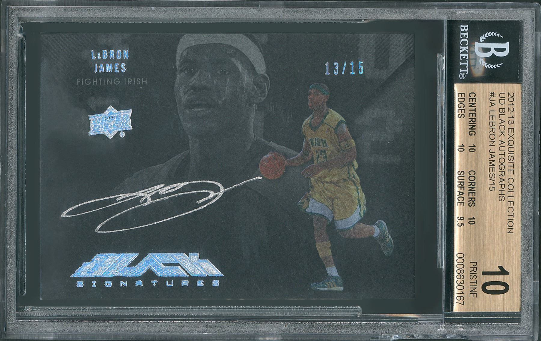 The greatest basketball player is found on this extremely rare card from the 2012-13 Upper Deck Exquisite Collection card with autograph, and is numbered 13/15. In addition, not only is this card one of only 15 produced it has also been graded and encapsulated by BECKETT at the PRISTINE 10 level, their highest potential grade.
