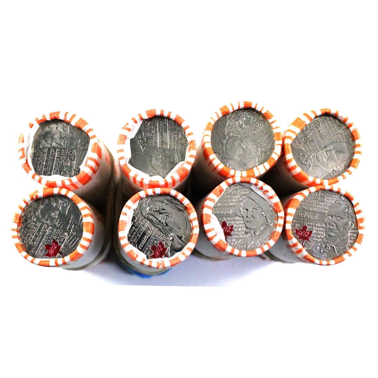 *2012-2013 War of 1812 Circulated 25-cent Rolls. Lot includes: Brock Coloured & Non-coloured, Tecumseh 2x Coloured & 2x Non-Coloured, and Laura Secord Coloured & Non-coloured. 8 Rolls