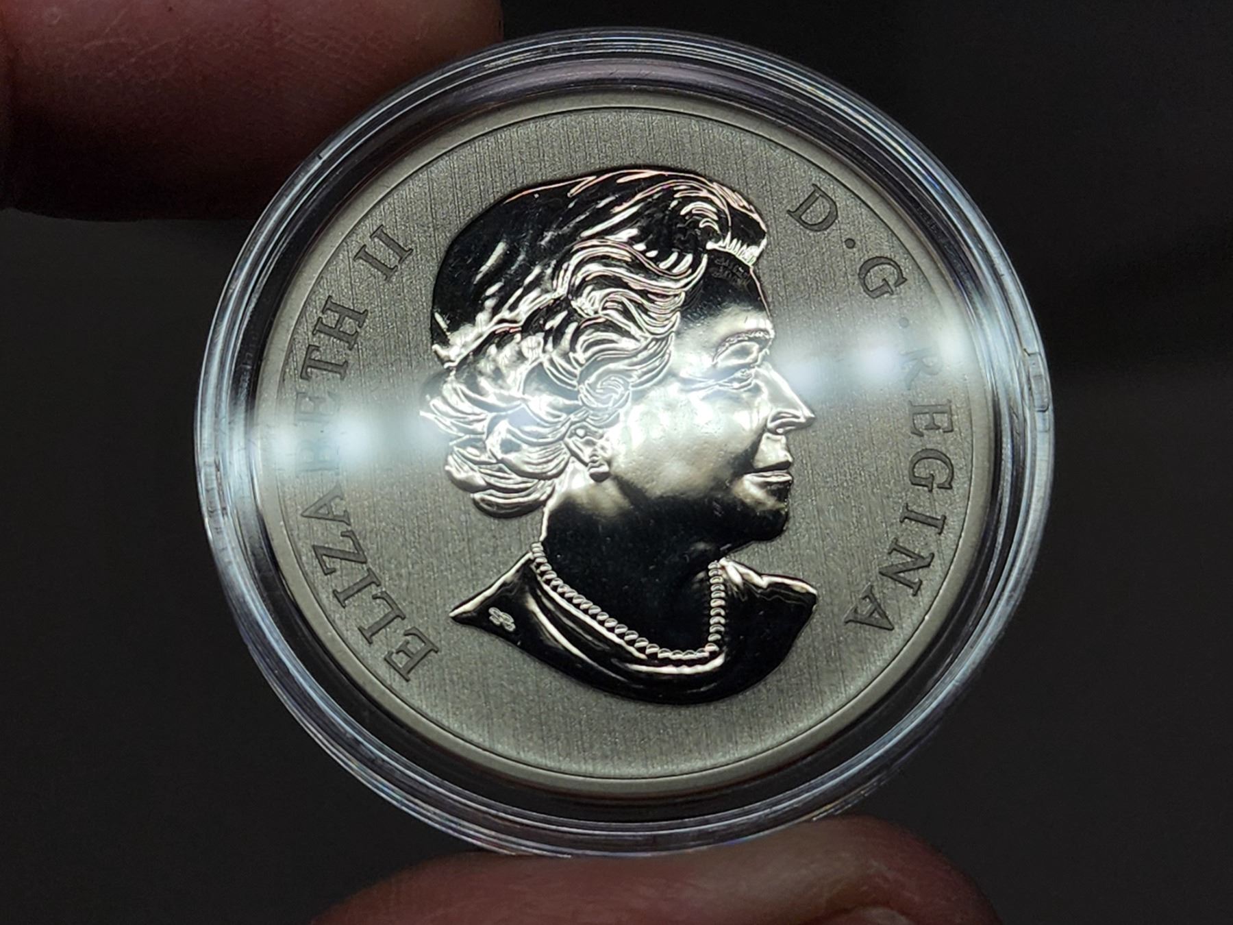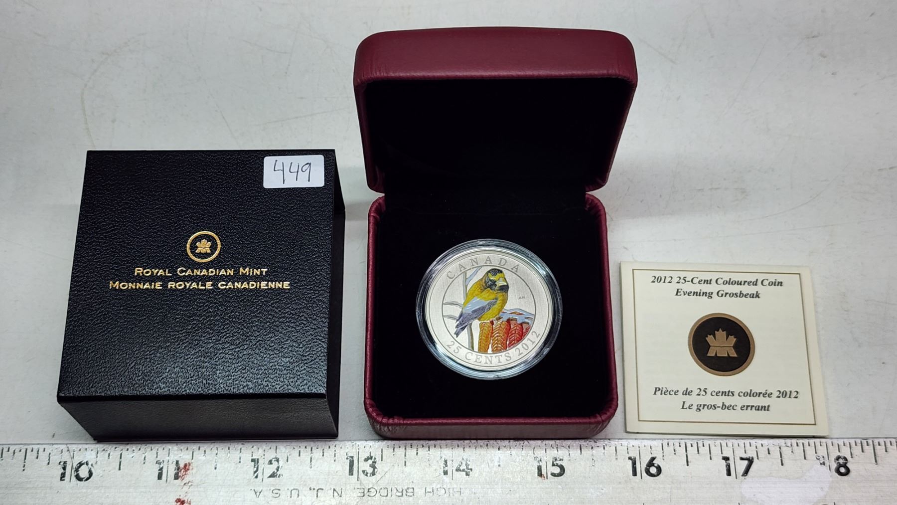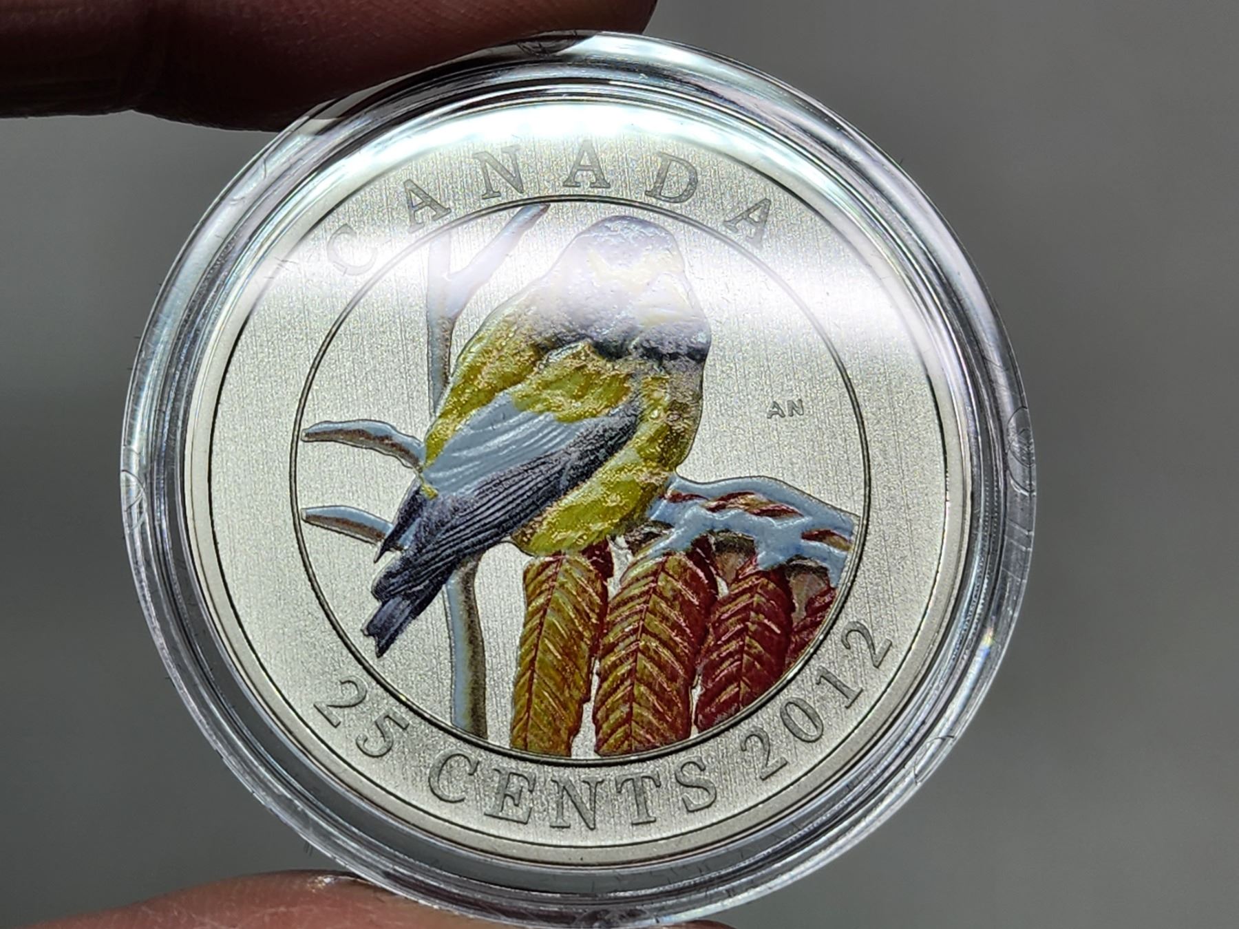 2012 25 Cent Colourized Evening Grosbeak. Specimen. Housed in its original RCM case & box of issue.