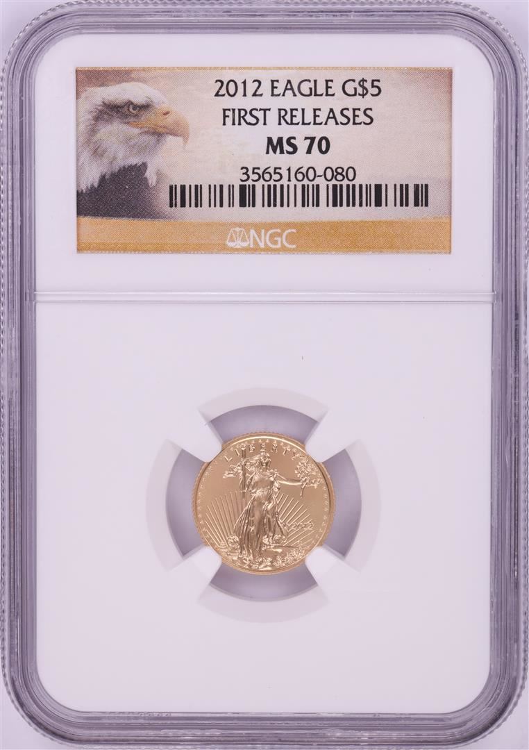 One 2012 $5 American Gold Eagle Coin NGC MS70 First Releases. NGC Certified.