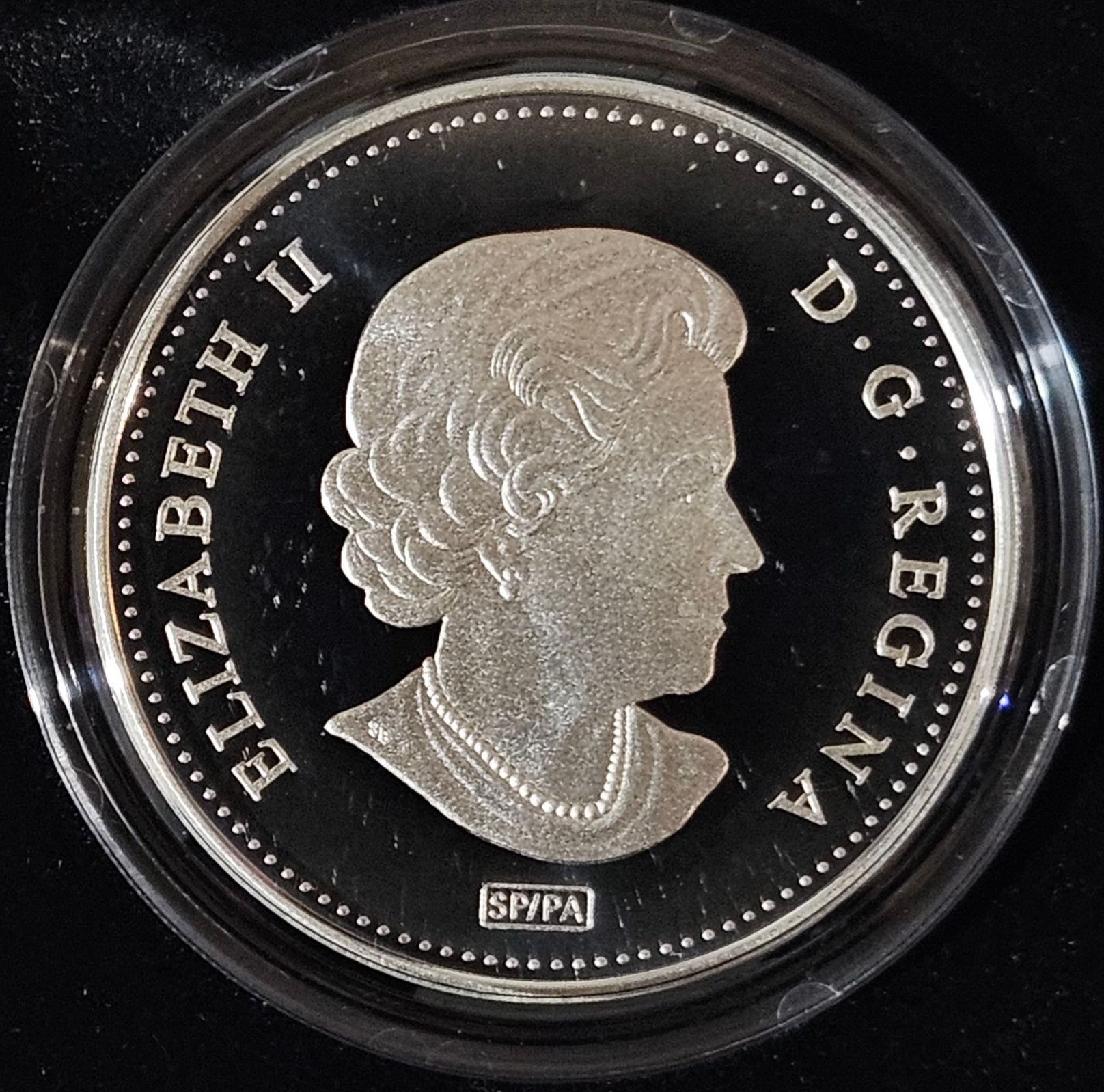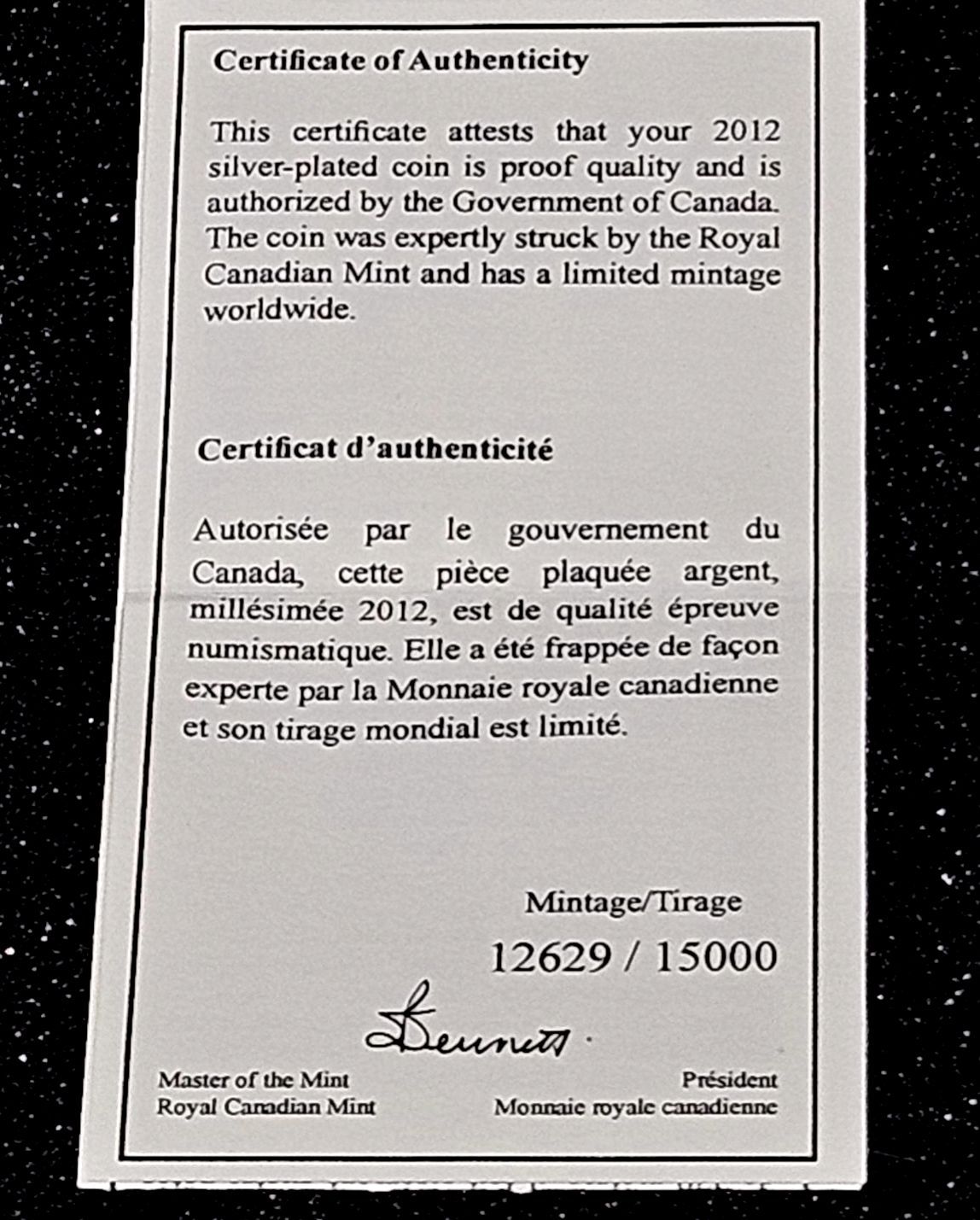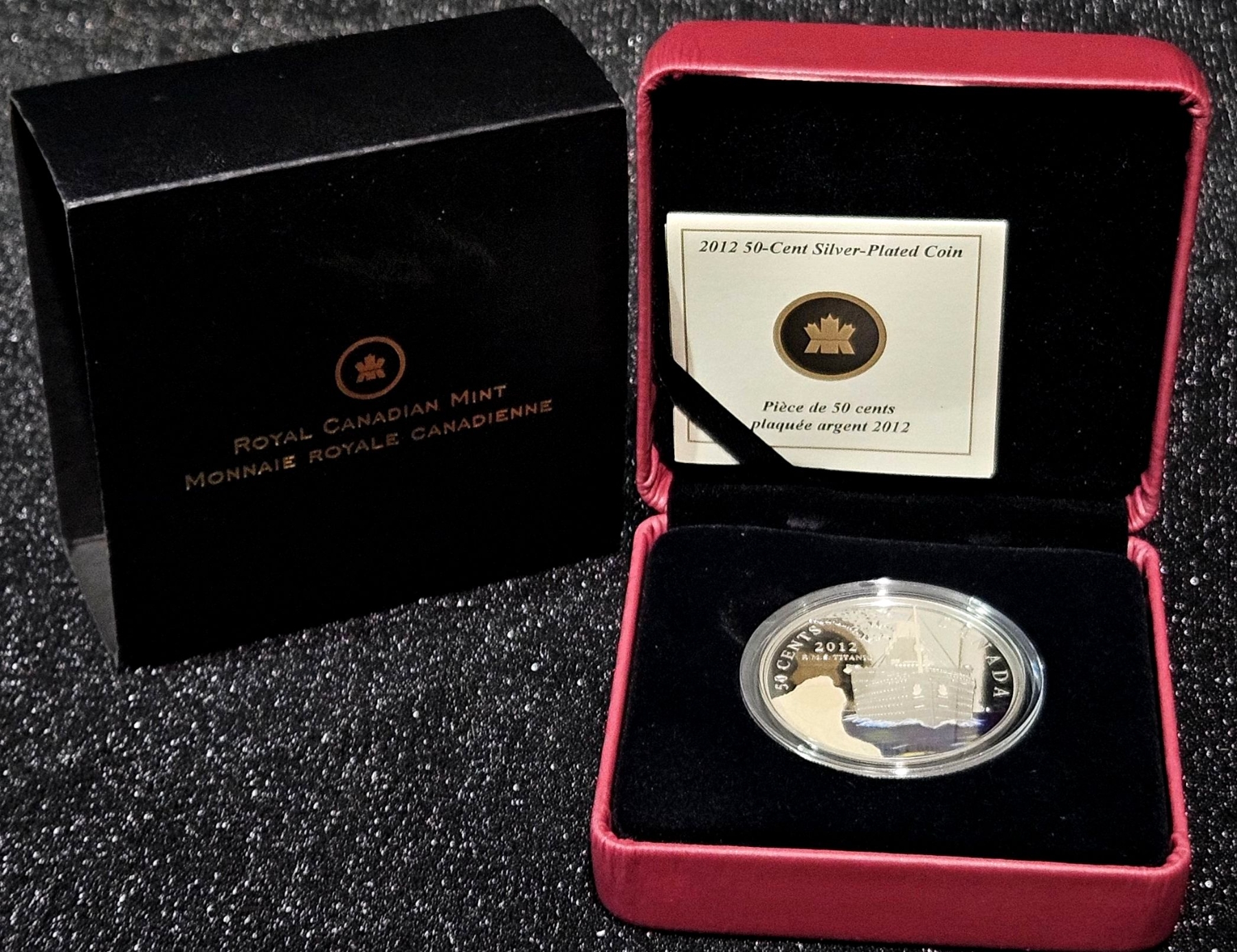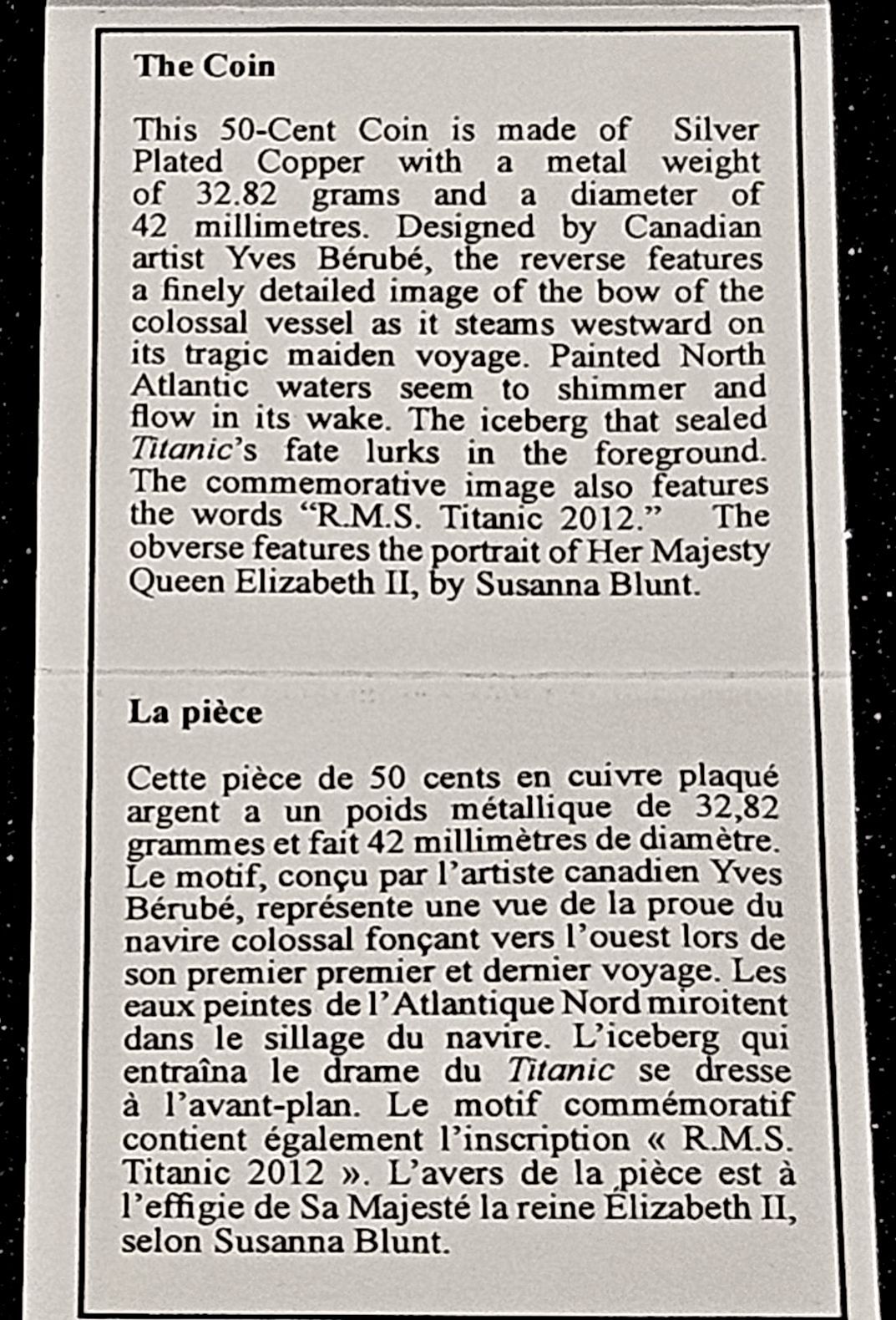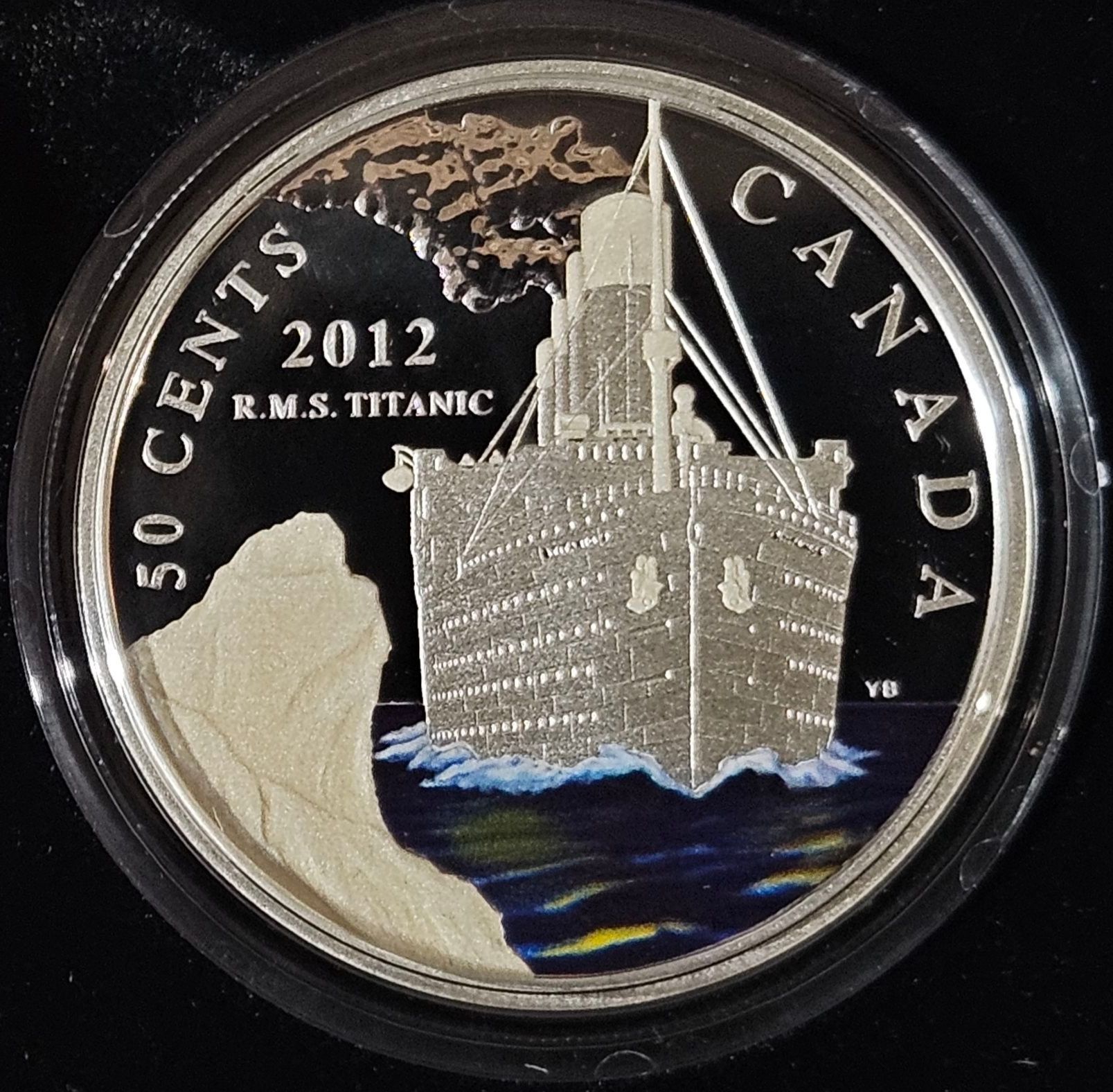 The reverse features a finely detailed image of the bow of the colossal vessel as it steams westward on its tragic maiden voyage. Painted North Atlantic waters seem to shimmer and flow in its wake. The iceberg that sealed Titanic’s fate lurks in the foreground. The commemorative image also features the words “R.M.S. Titanic 2012.” Mintage is 12629/15000.