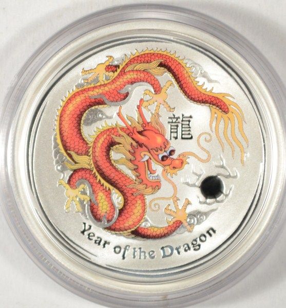 THE POPULAR HALF OUNCE PAINTED YEAR OF THE DRAGON COIN FROM AUSTRALIA, ESTIMATE $40.00 TO $45.00