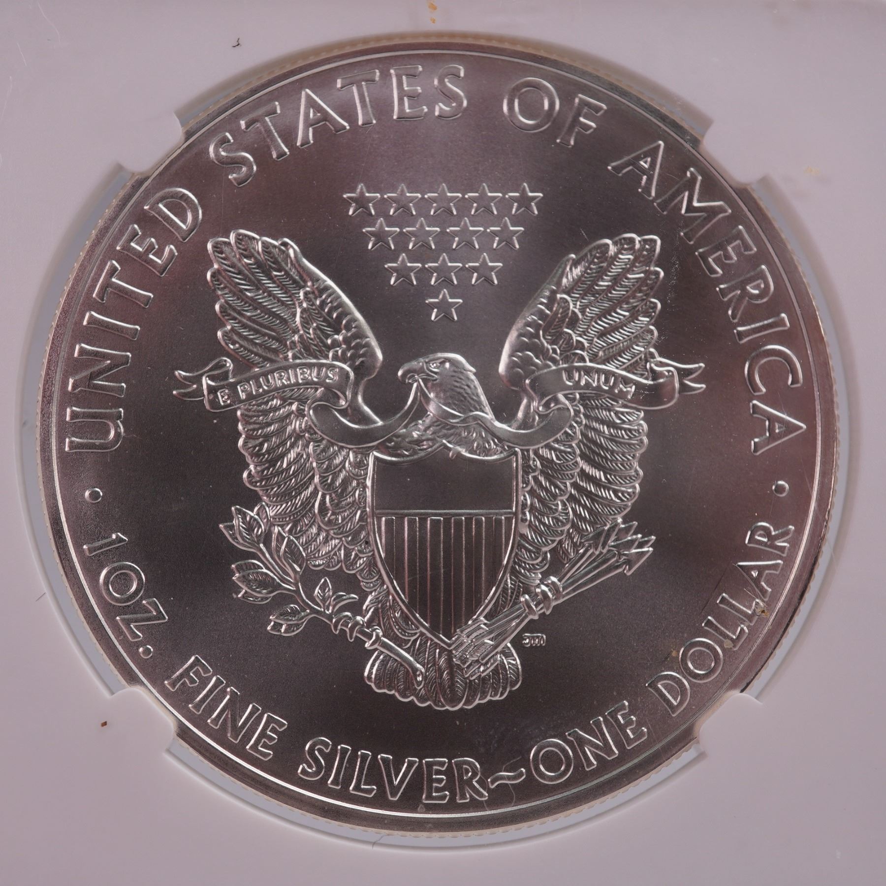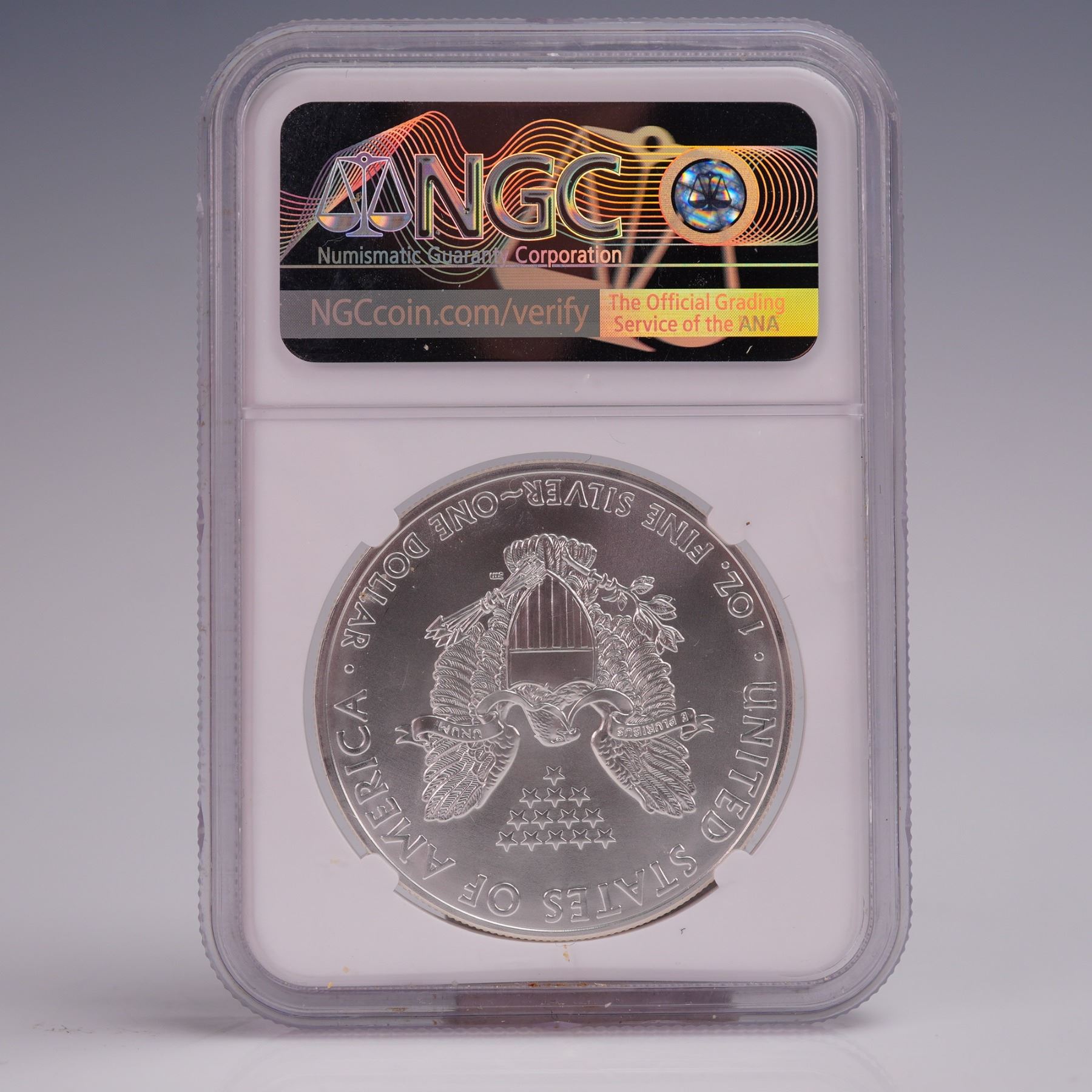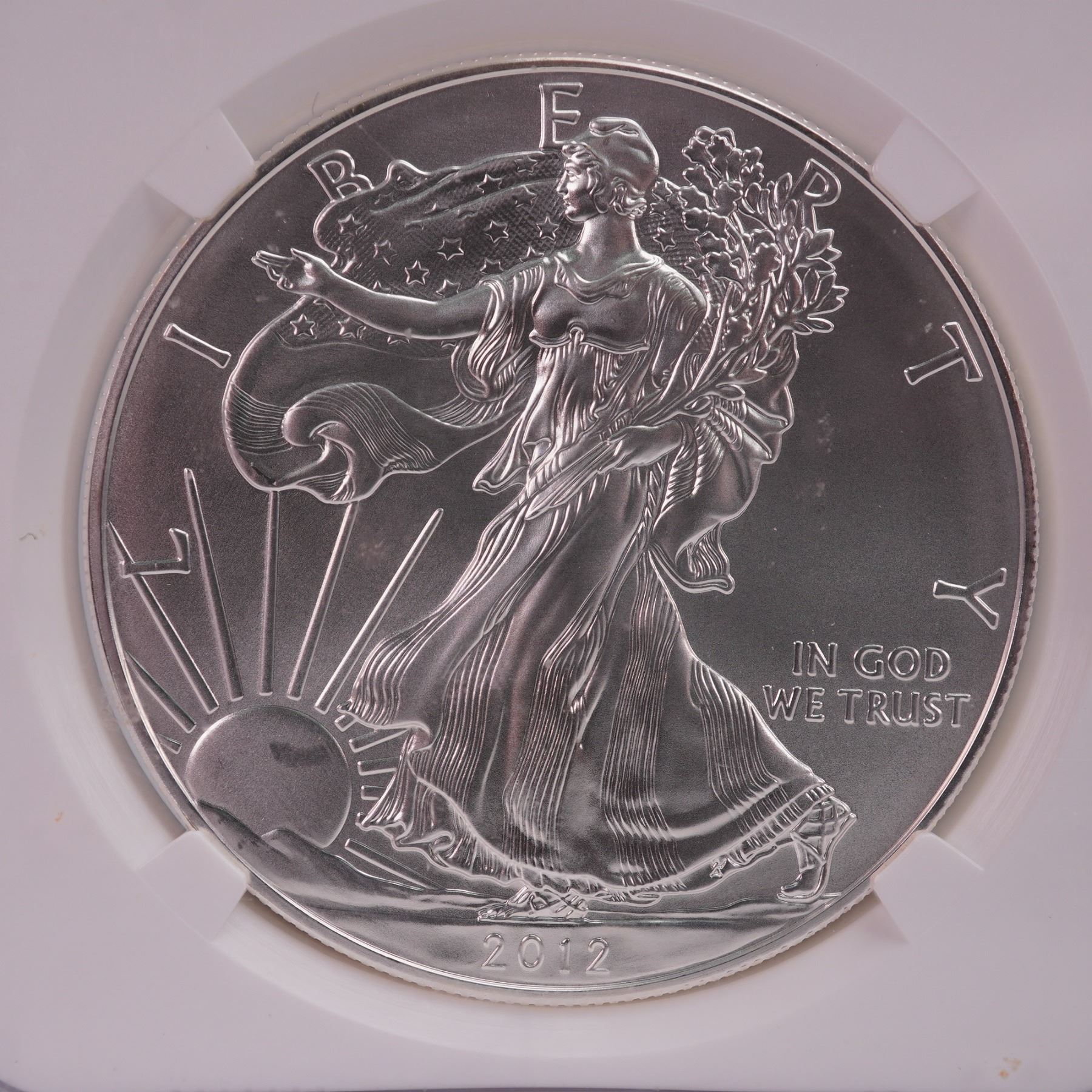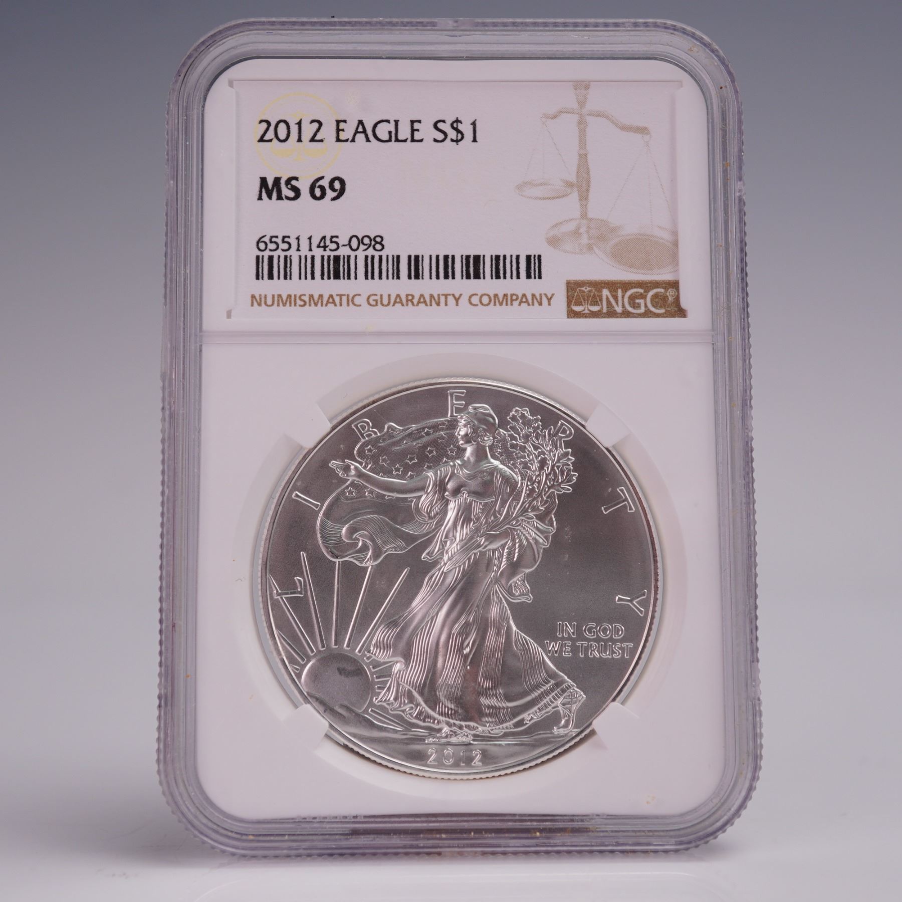 A 2012 American Silver Eagle one-dollar coin encapsulated by the Numismatic Guaranty Company and assigned a Mint State 69 grade. Struck from one troy ounce of .999 fine silver. The obverse features the classic Walking Liberty imagery portraying Liberty in flowing robes, advancing toward the sun-drenched horizon with branches of oak and laurel in her left arm and the flag of the United States draped around her shoulders. The reverse presents a heraldic eagle with outstretched wings, grasping arrows and an olive branch, bearing a Union shield at its breast and a cluster of thirteen stars above; symbols of both martial vigilance and national unity. Encased in a graded NGC holder for further preservation and authentication. Slab measures: 2.25"L x 0.25"W x 3.25"H. Coin diameter: 40.6 mm.