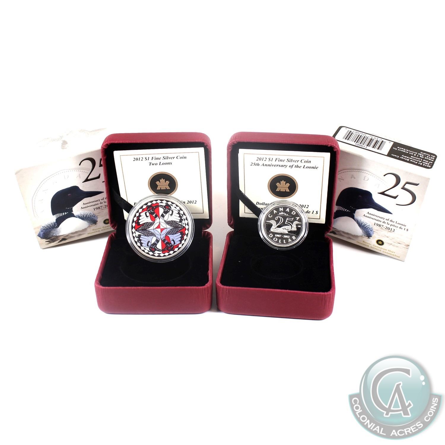 2012 Canada $1 Artistic Two Loons & 2012 $1 25th Anniversary of the Loonie Fine Silver Coins. 2pcs (TAX Exempt)