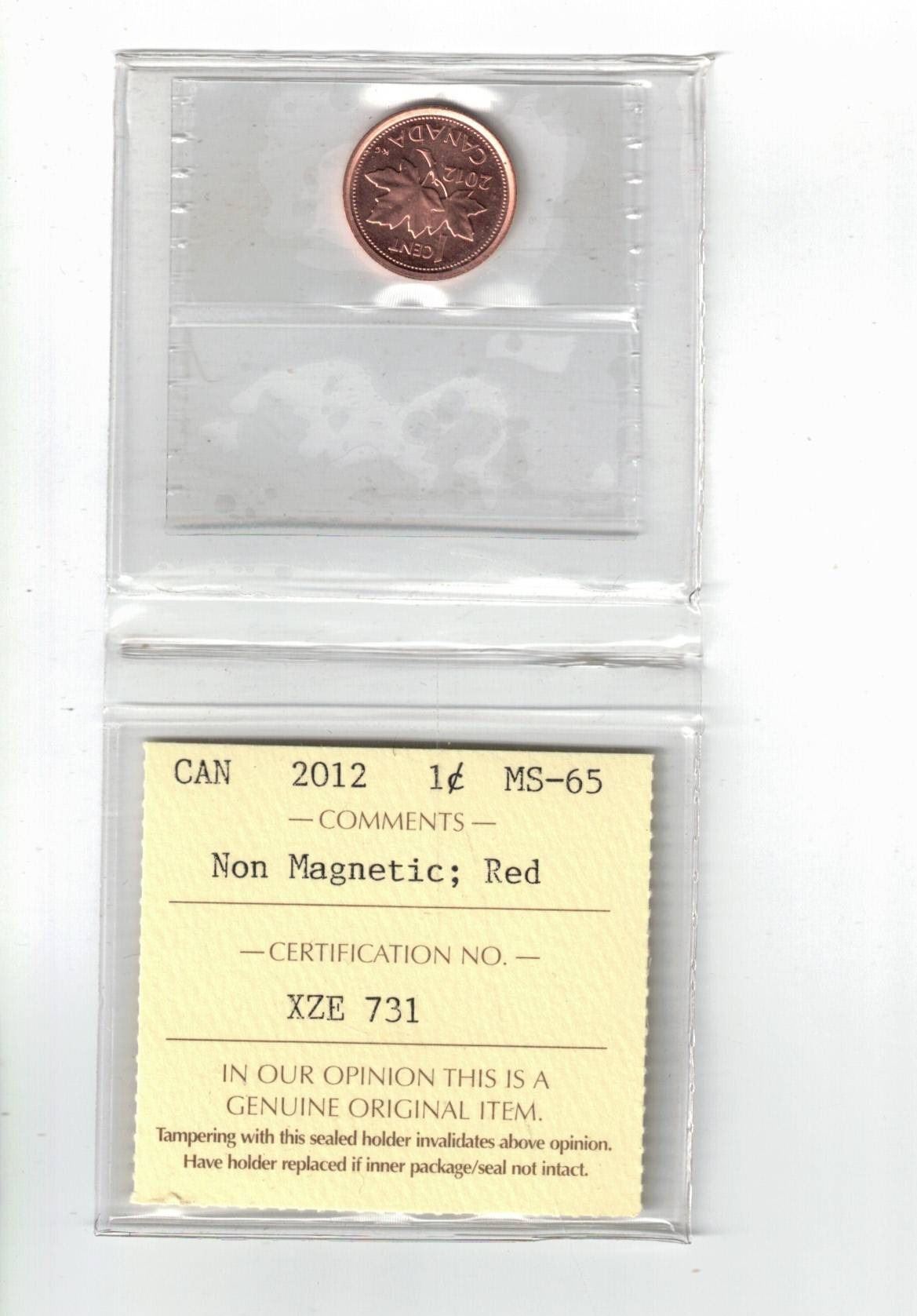 2012 Canada 1¢; Red; Non Magnetic, Certified ICCS MS65
