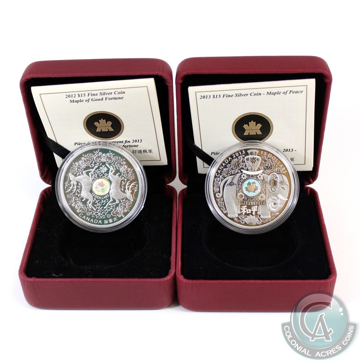 2012 Canada $15 Maple of Good Fortune & 2013 $15 Maple of Peace Fine Silver Hologram Coins (Missing outer sleeves). 2pcs (TAX Exempt)