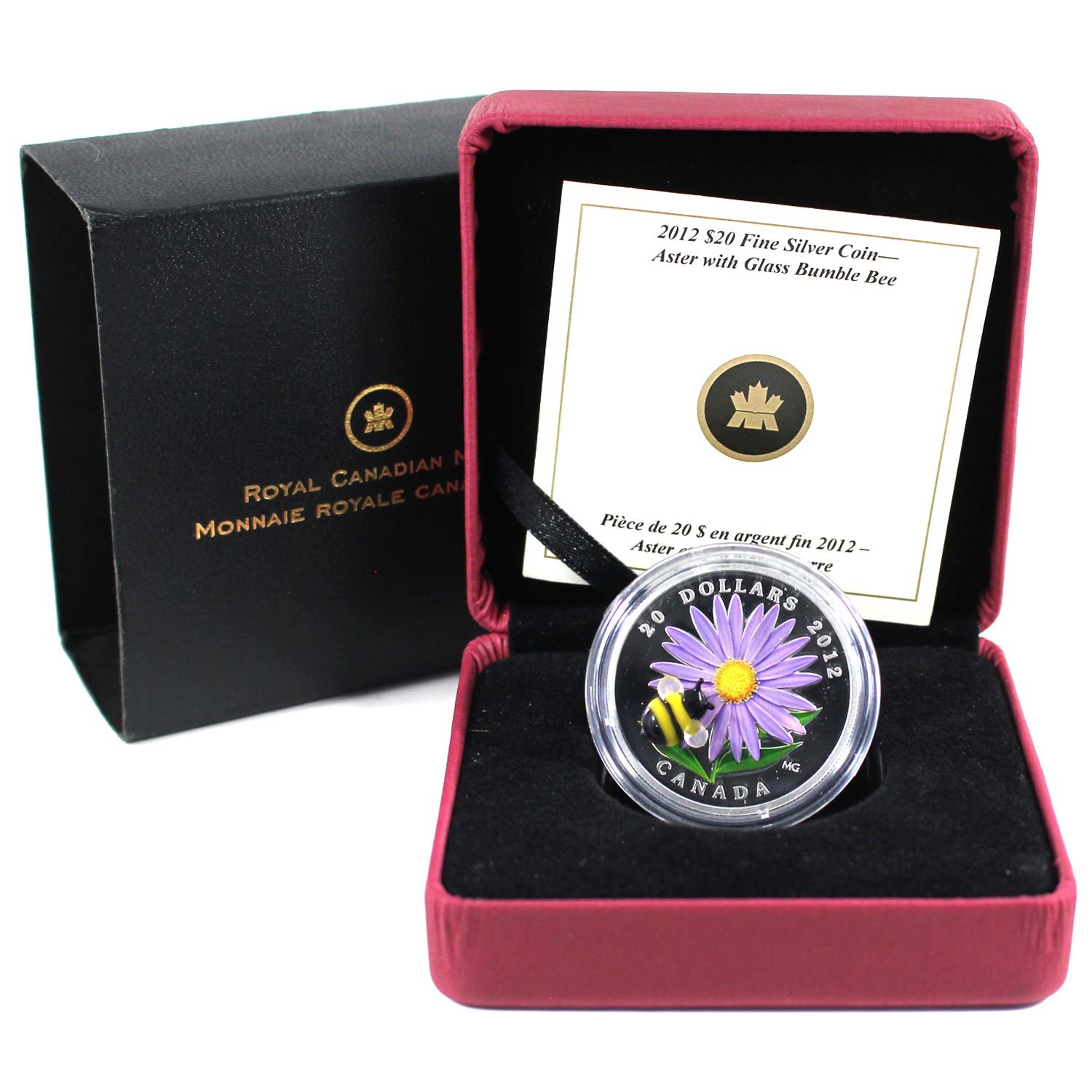 2012 Canada $20 Aster with Venetian Glass Bumble Bee Fine Silver. A lightly worn outer cardboard sleeve doesn't take away from the beautifully crafted glass bumble bee on this coin!