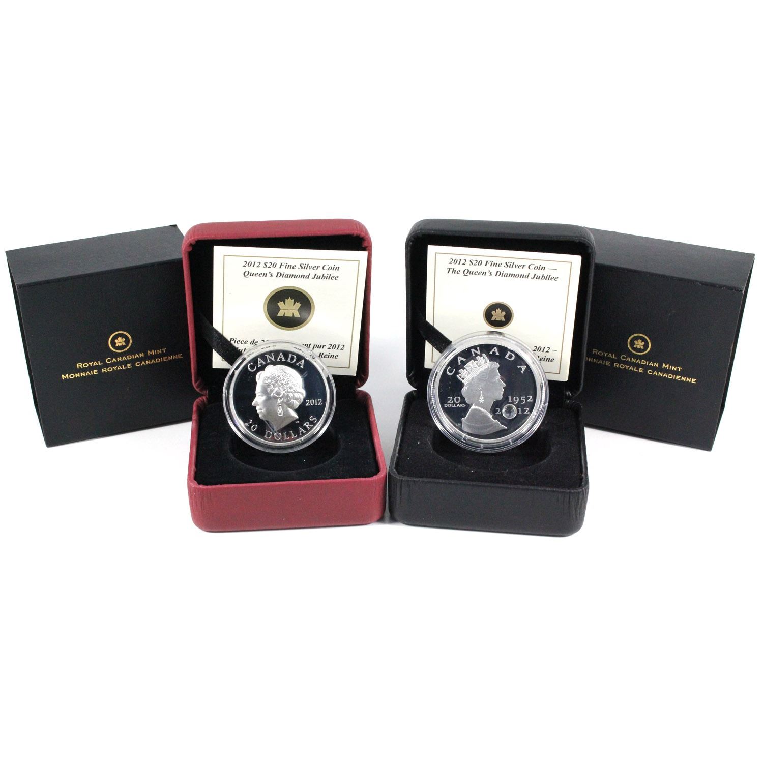 2012 Canada $20 Queen's Diamond Jubilee & 2012 $20 Queen's Diamond Jubilee with Crystal Fine Silver Coins (Regular capsule scuffed & crystal capsule lightly scratched). 2pcs (TAX Exempt)