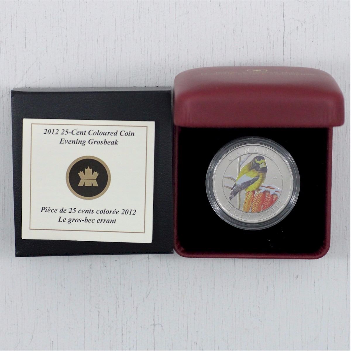 2012 Canada 25-cent Evening Grosbeak Coloured Coin. Buyers Premium will be added on all items as per our terms of sale. We accept Paypal, Credit Card, E-Transfer Payments, Cheque or Money Orders (there is an additional 3% fee for using Paypal or Credit Card). All invoices will be emailed immediately following the auction, please contact us if you would like to pay by credit card or receive a new revised lower total for mailing in payment or sending an e-transfer (3% discount). All Items Are Sold "AS IS", no returns