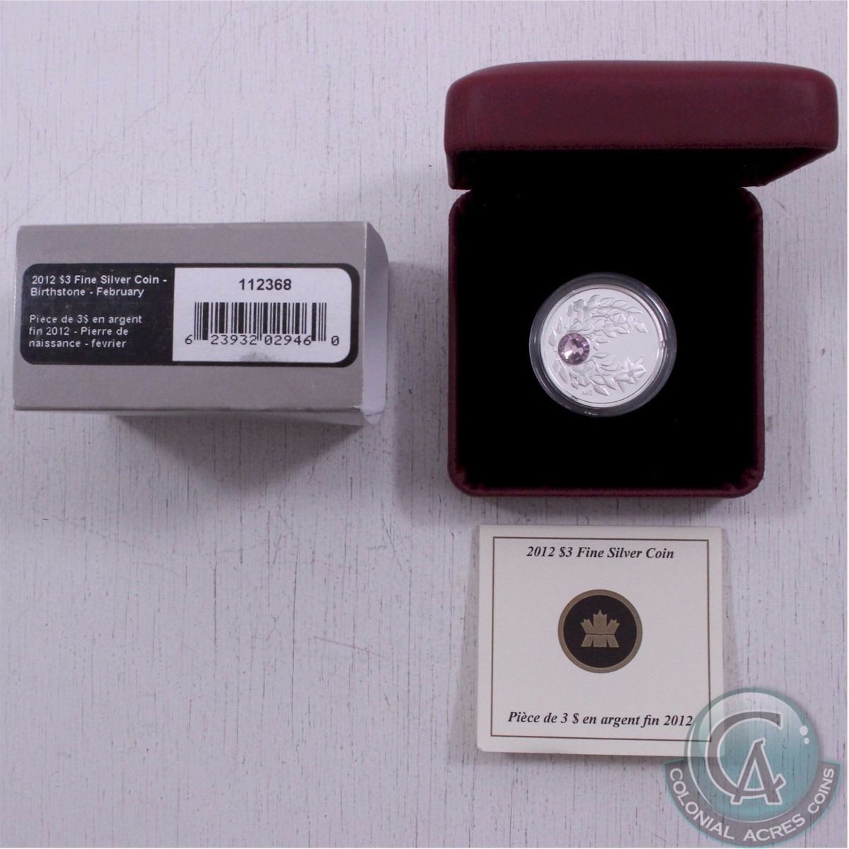 2012 Canada $3 Crystal Birthstone Collection - February (Amethyst) Fine Silver Coin (TAX Exempt). Comes with all original Mint packaging (capsule is lightly scratched)