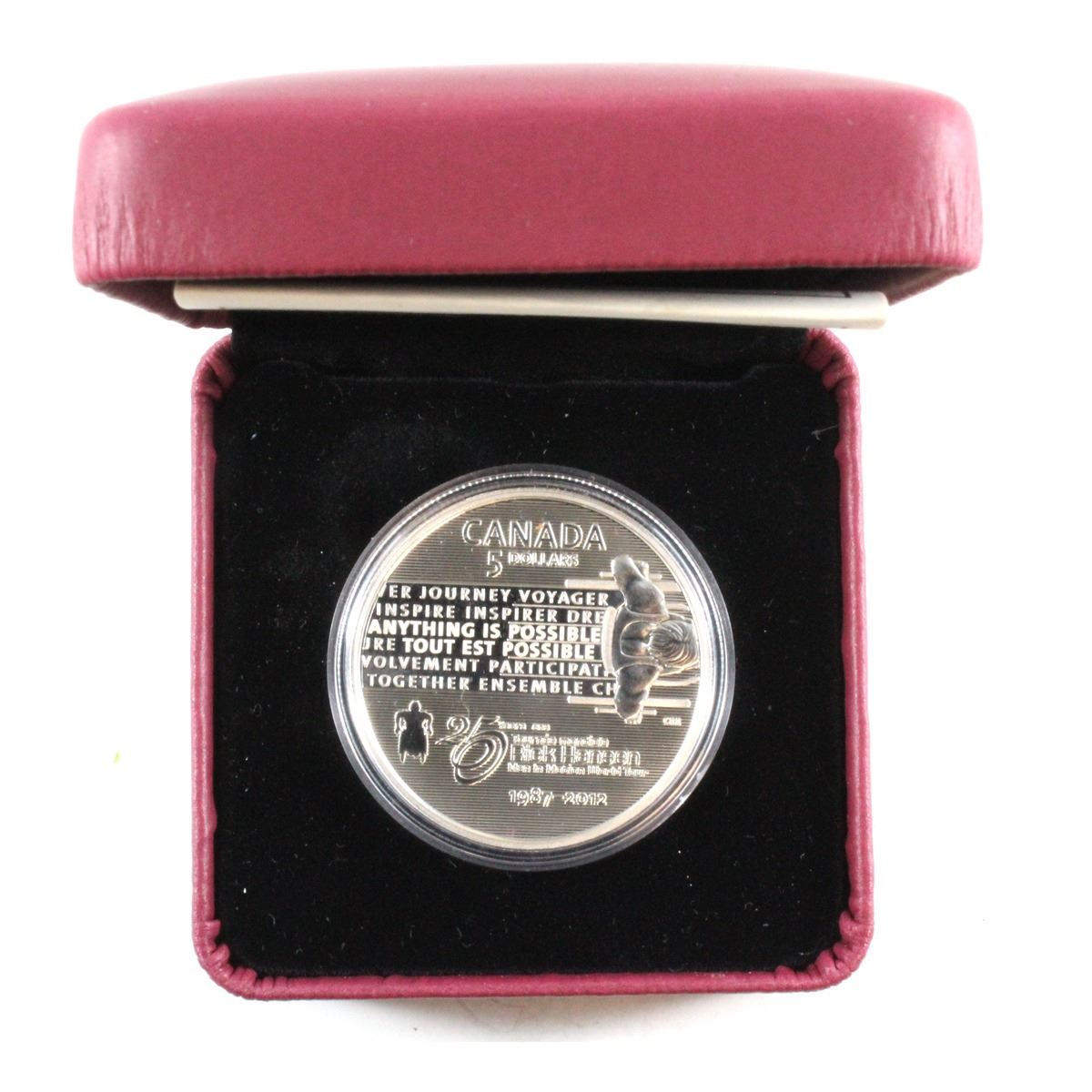 2012 Canada $5 25th Anniversary of the Rick Hansen Man-In-Motion Tour Fine Silver Coin. (NO TAX). Buyers Premium will be added on all items as per our terms of sale. We accept Paypal, Credit Card, E-Transfer Payments, Cheque or Money Orders (there is an additional 3% fee for using Paypal or Credit Card). All invoices will be emailed immediately following the auction, please contact us if you would like to pay by credit card or receive a new revised lower total for mailing in payment or sending an e-transfer (3% discount). All Items Are Sold "AS IS", no returns