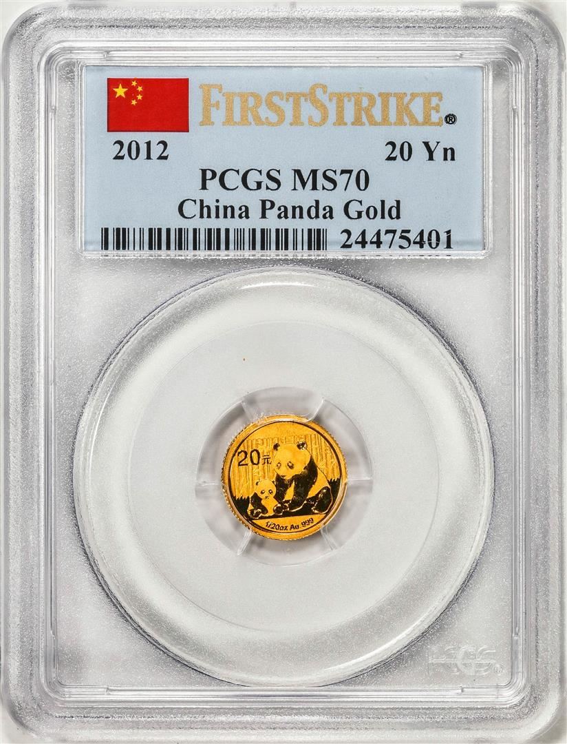 One 2012 China 20 Yuan Gold Panda Coin PCGS MS70 First Strike. PCGS Graded.