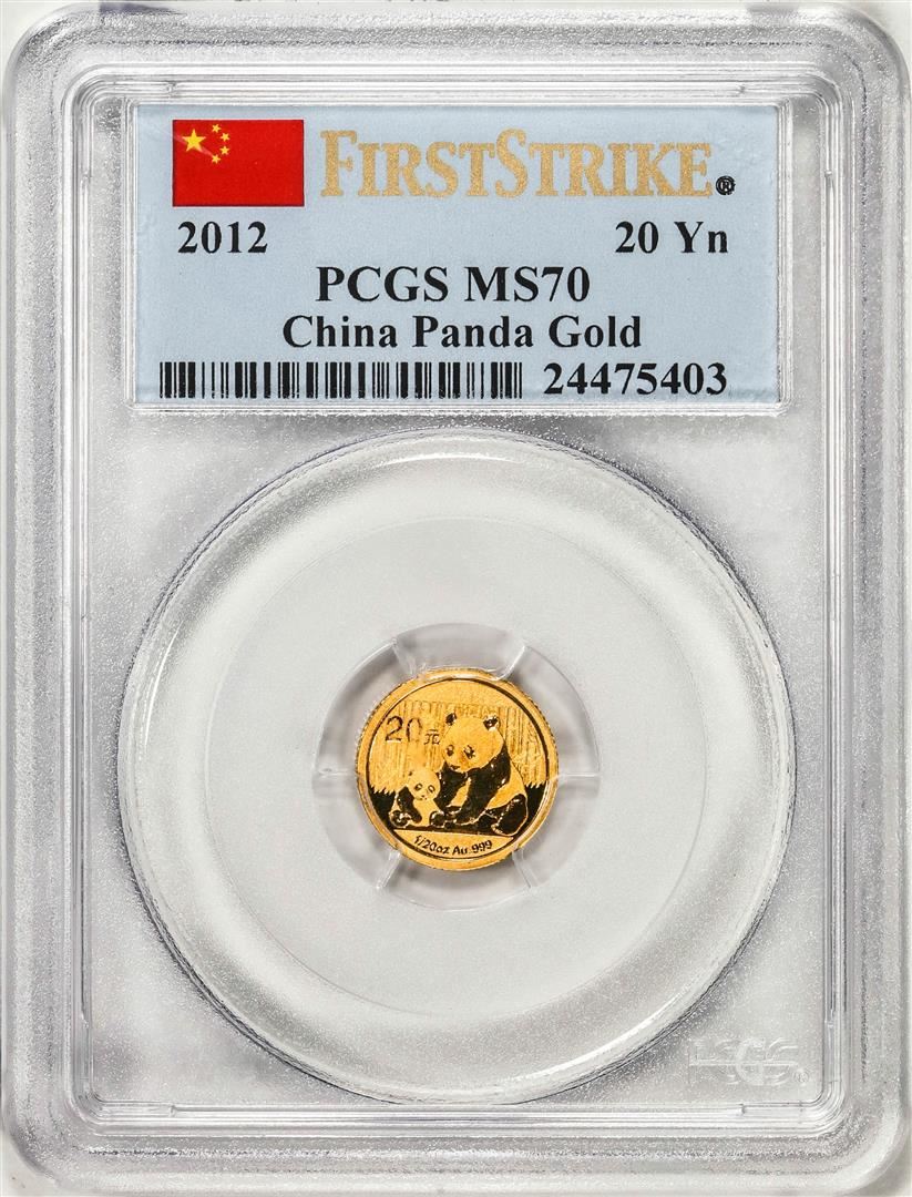 One 2012 China 20 Yuan Gold Panda Coin PCGS MS70 First Strike. PCGS Graded.