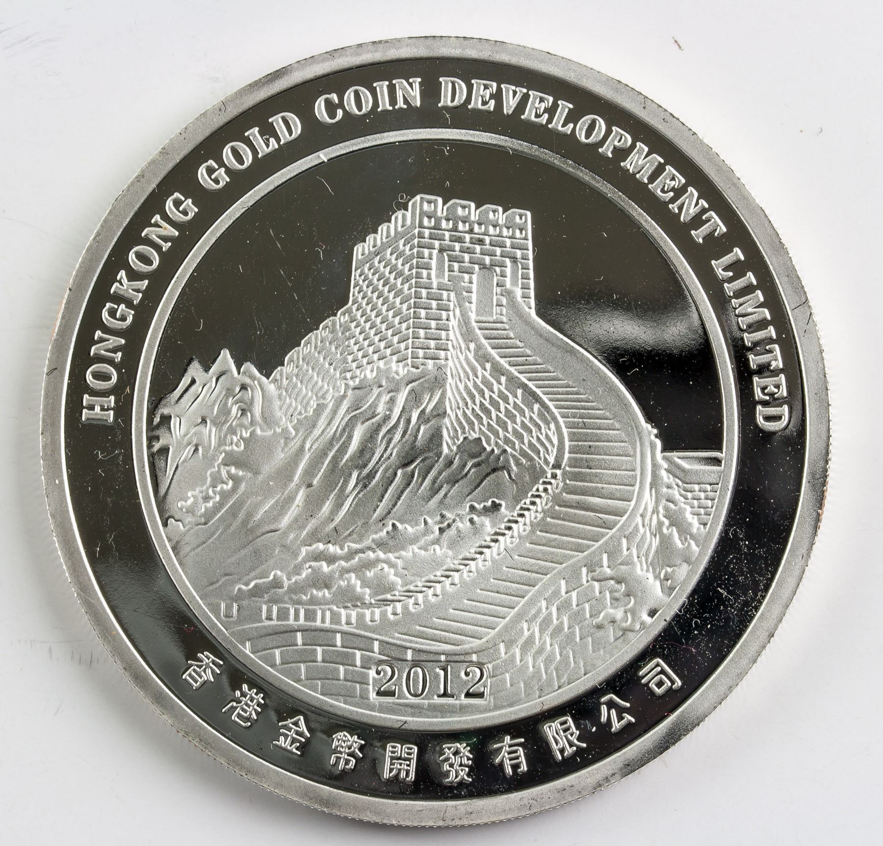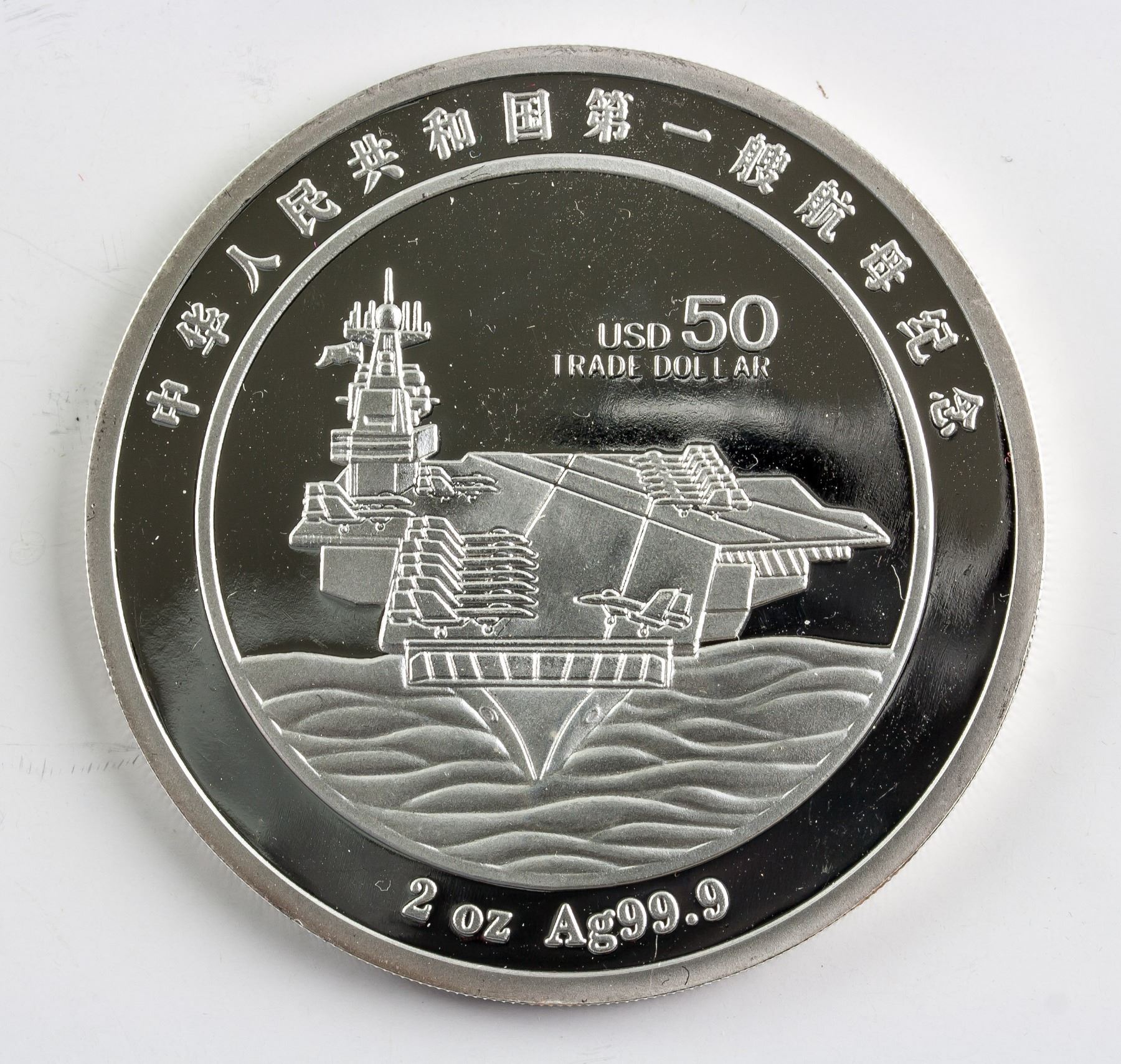 2012 Chinese commemorative medal; obverse engraved aircraft carrier; lettering Zhong Hua Ren Min Gong He Guo Di Yi Sou Hang Mu Ji Nian, USD 50, TRADE DOLLAR, 2 oz AG99.9; reverse engraved the Great Wall; lettering HONGKONG GOLD COIN DEVELOPMENT LIMITED, Xiang Gang Jin Bi Kai Fa You Xian Gong Si; reeded edge; Diameter: 6 cm, 59 grams