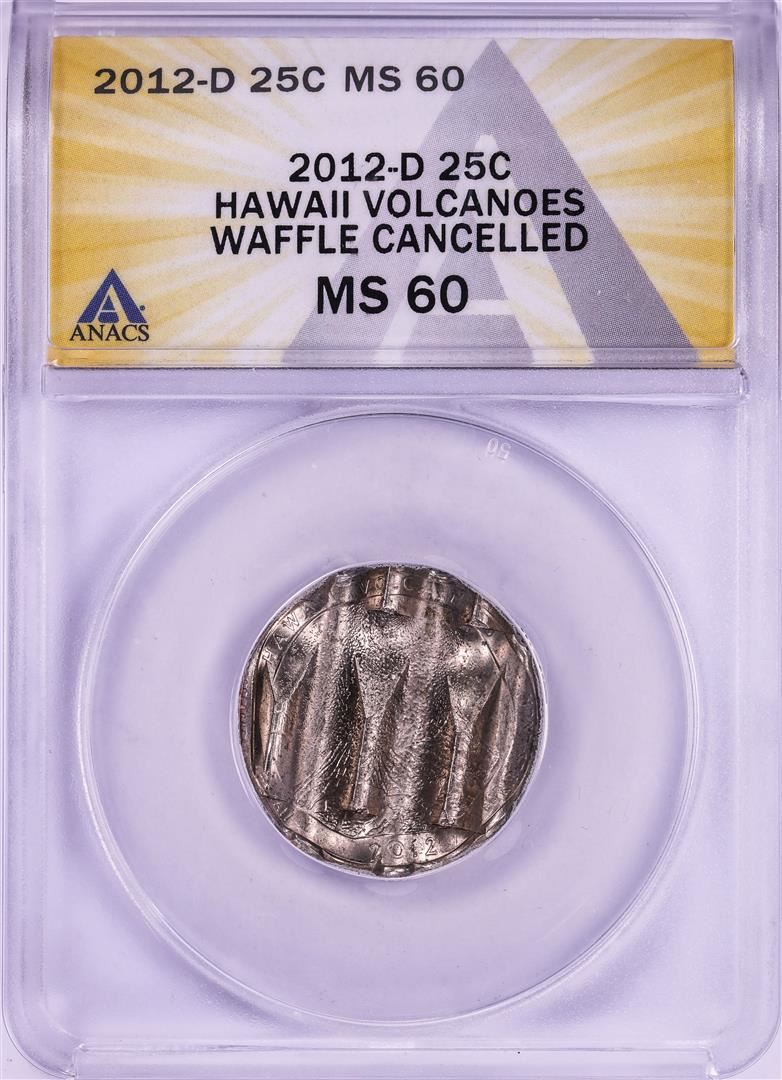 One 2012-D Hawaii Volcanoes ATB Quarter Waffle Cancelled Coin ANACS MS60. ANACS Certified.