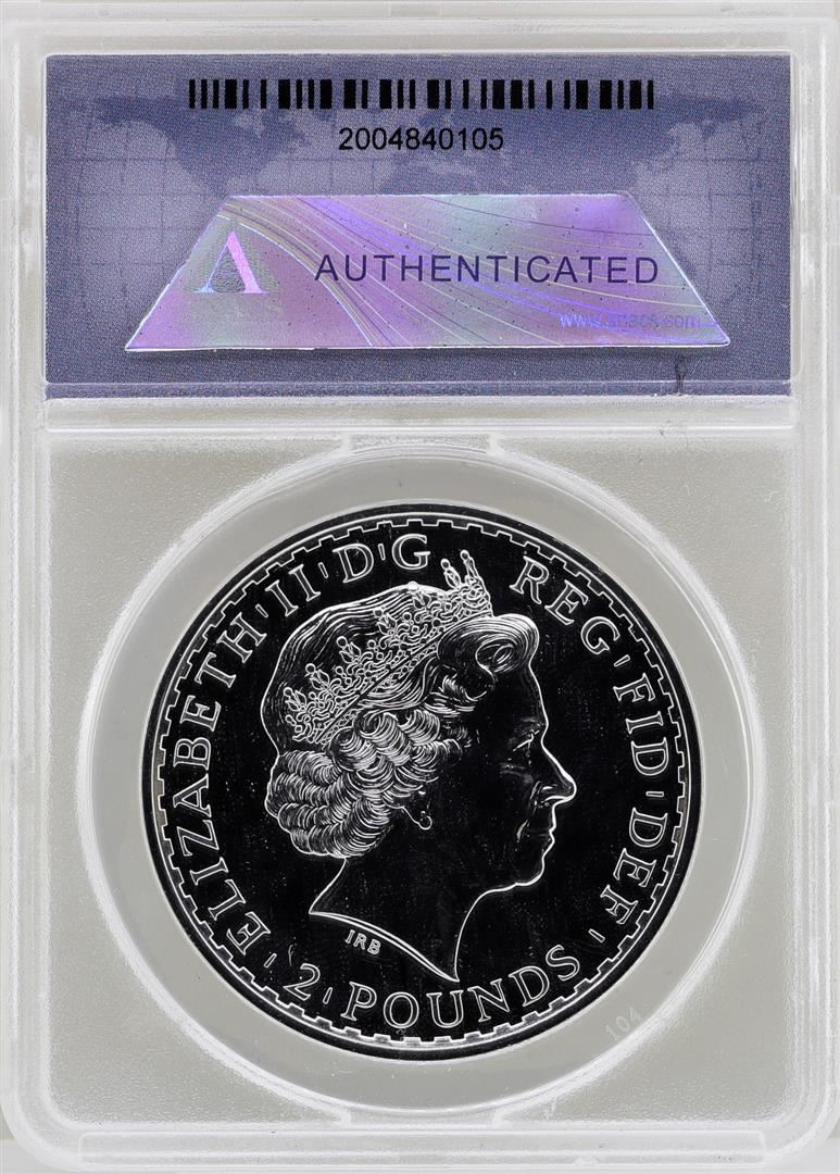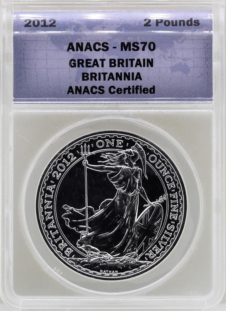 One 2012 Great Britain Britannia 2 Pounds Silver Coin ANACS MS70. ANACS Certified.