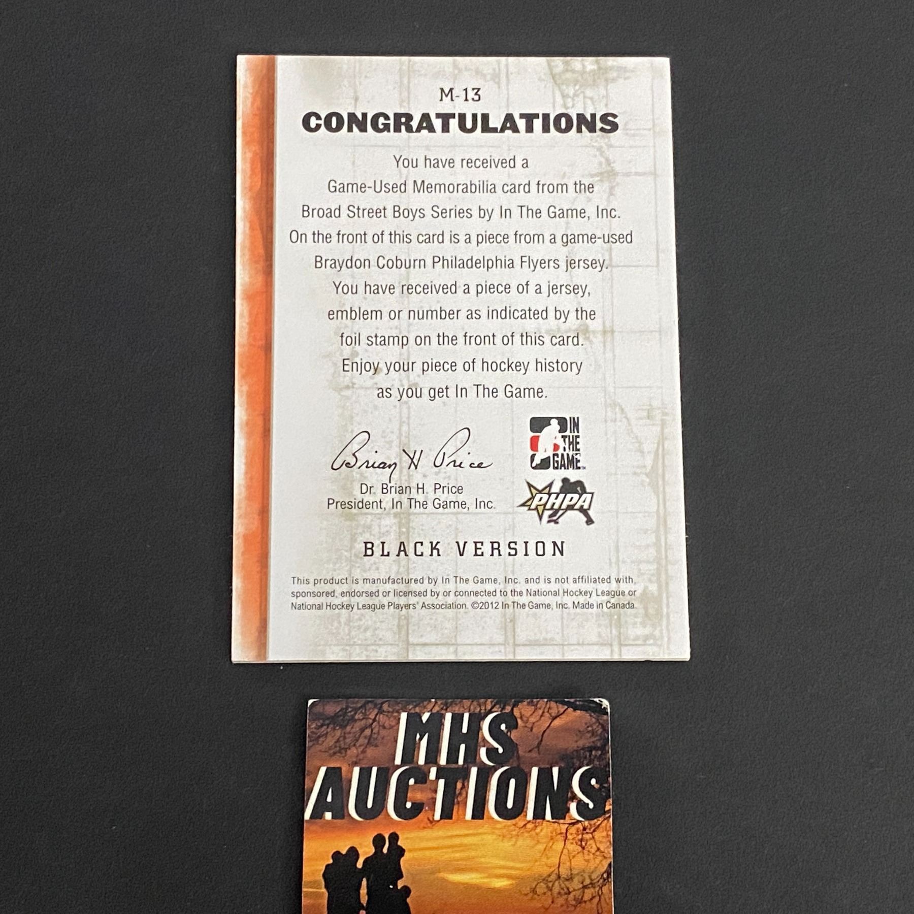 2012 IN THE GAME BRAYDON COBURN PATCH BLACK VERSION CARD #1 OF 1