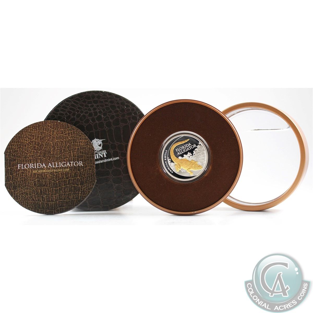 2012 Niue Florida Alligator 1oz Gilded Fine Silver Coin in Deluxe Packaging (hard plastic case has scratches) TAX Exempt