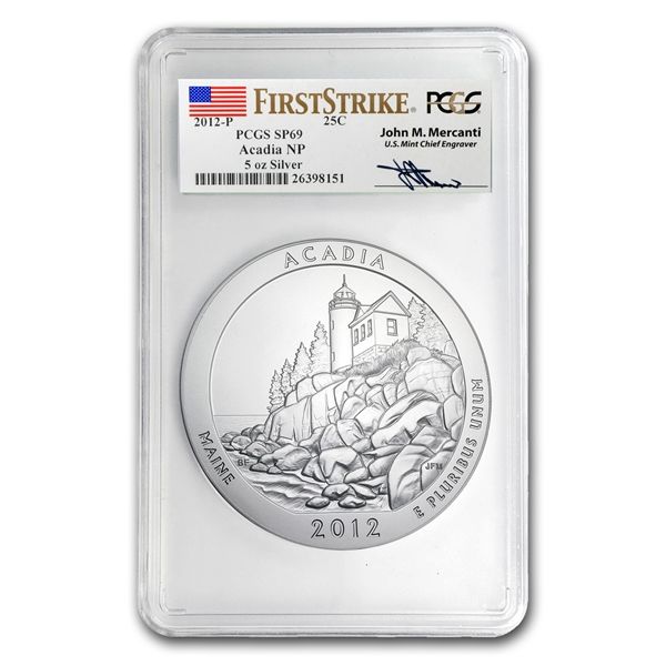 2012-P 5 oz Acadia SP-69 First Strike PCGS John Mercant **|**|** 2012-P 5 oz Acadia SP-69 First Strike PCGS John Mercanti Label ; MSRP: $1300