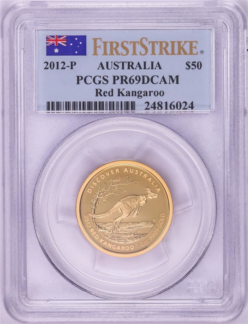One 2012-P $50 Australia Red Kangaroo Proof Gold Coin PCGS PR69DCAM First Strike. PCGS Graded.