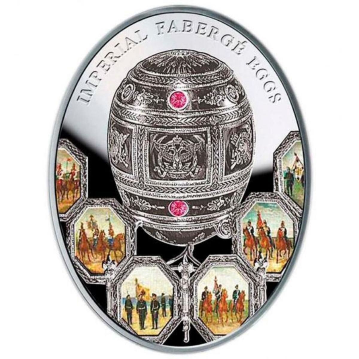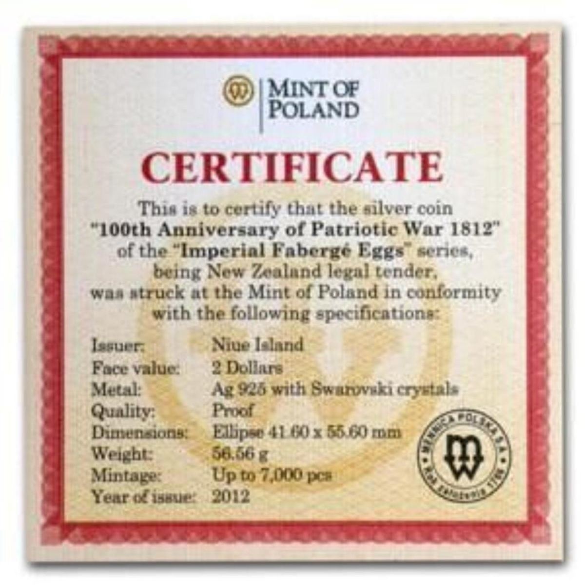 Imperial Faberge Eggs are a magnificent series of minted works by Carl Peter Faberge and his assistants. Thanks to the exuberance, intricacy and splendor of decoration, Faberge Eggs have gained a huge popularity as jewelry masterpieces. Now, struck in .925 proof silver, they are sure to become an extravagant and luxurious addition to any modern coin collection. Obverse: At the bottom – open Spring Flowers Egg (1899-1903) with a miniature basket of wood anemones inside. Above – the Niue Island’s Coat of Arms with the inscription “ELIZABETH II†and the mint’s mark (m/w) below. Around the Queen’s effigy – a decorative neorococo scroll ornament. At the top – the issuer’s name: NIUE ISLAND. On the right – a nominal value of the coin (2 dollars), on the left – the year of issue 2012. The forthcoming coin of the collection is the “100th Anniversary of Patriotic War 1812†– inspired by The Napoleonic Egg. Reverse: In the central part – the stylized image of the original "Napoleonic Egg ". At the top, along the edge - the name of the series in English: IMPERIAL FABERGE EGGS. At the bottom – a fragment of the six Russian regiments fought against the army of Napoleon, depicted in pad printing. - All items may be shipped or picked up locally within one week of sale. We will provide shipping estimates to the winning bidders or winning bidders may arrange their own shipping.