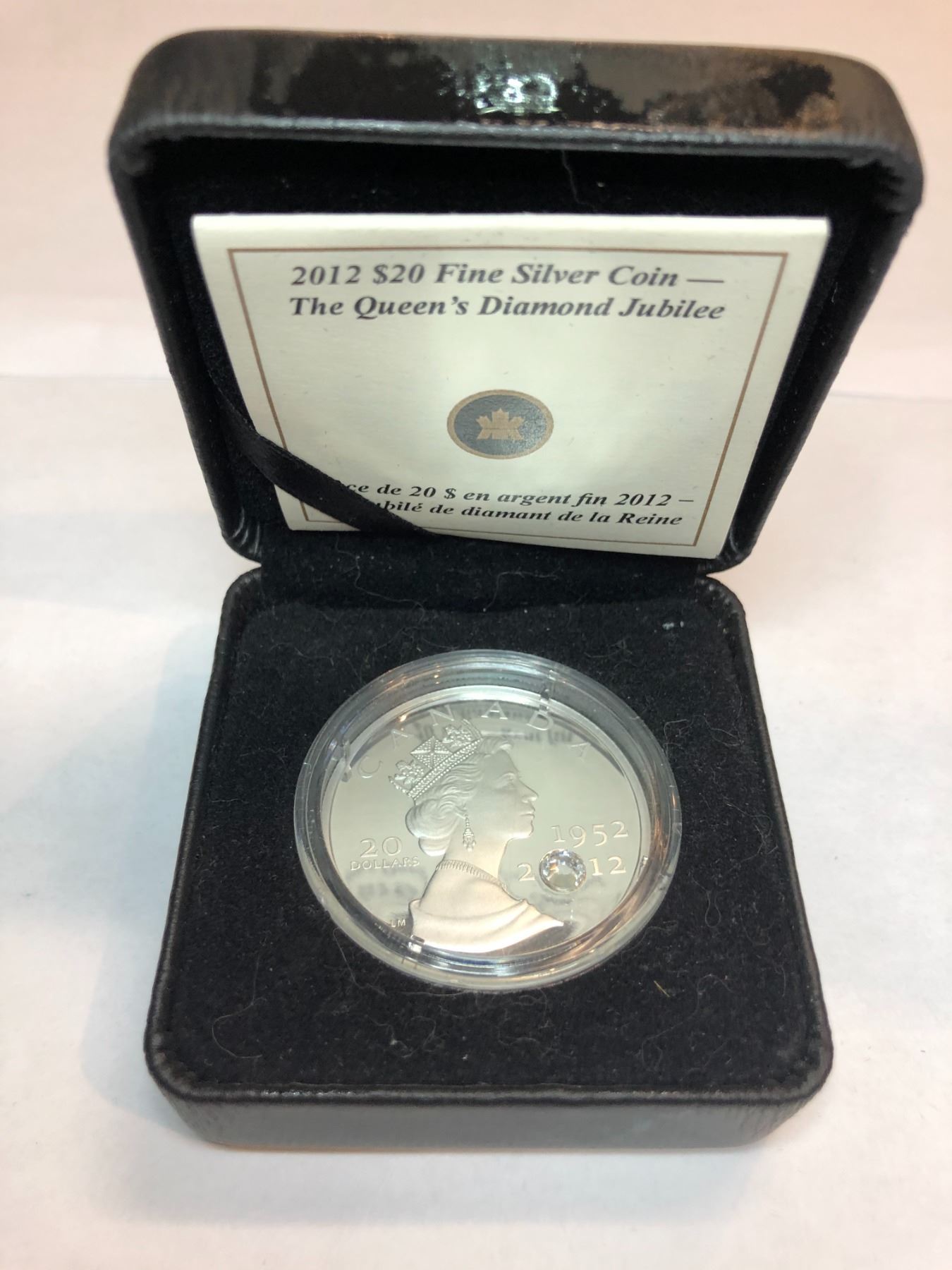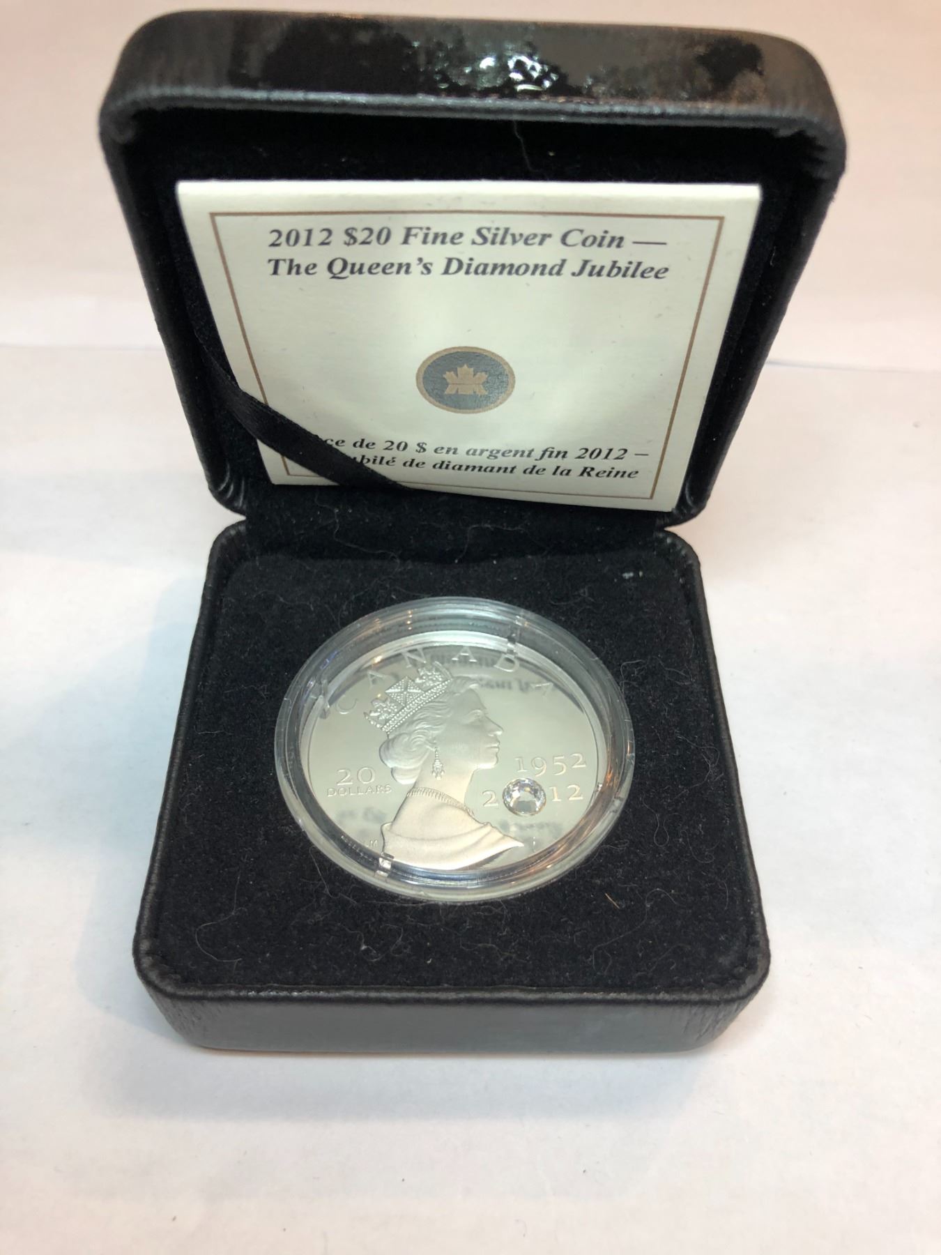 2012 Royal Canadian Mint $20 Fine Silver Coin This $20 coin is 99.99% Fine Silver and weighs 31.39 grams The design features her Majesty Queen Elizabeth II and the years of her majesty's jubilee reign 1952-2012