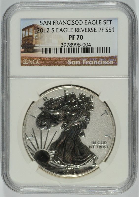 2012-S $1.00 AMERICAN SILVER EAGLE, REVERSE PROOF, NGC PROOF 70! TROLLEY LABEL