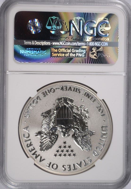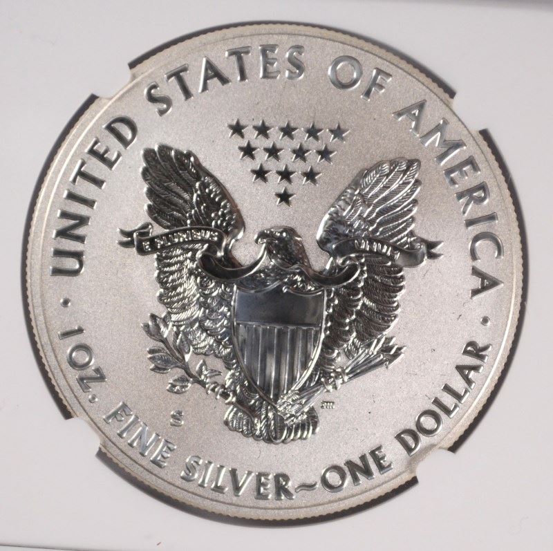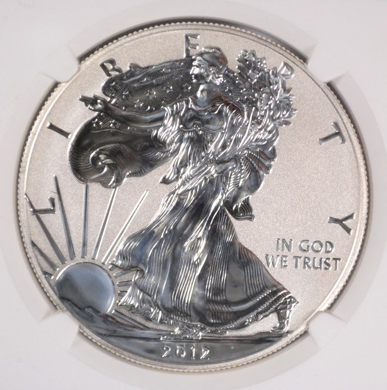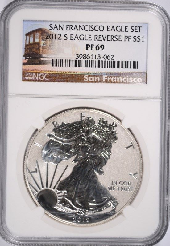 2012-S AMERICAN SILVER EAGLE, REVERSE PROOF, NGC PROOF-69 TROLLEY LABEL